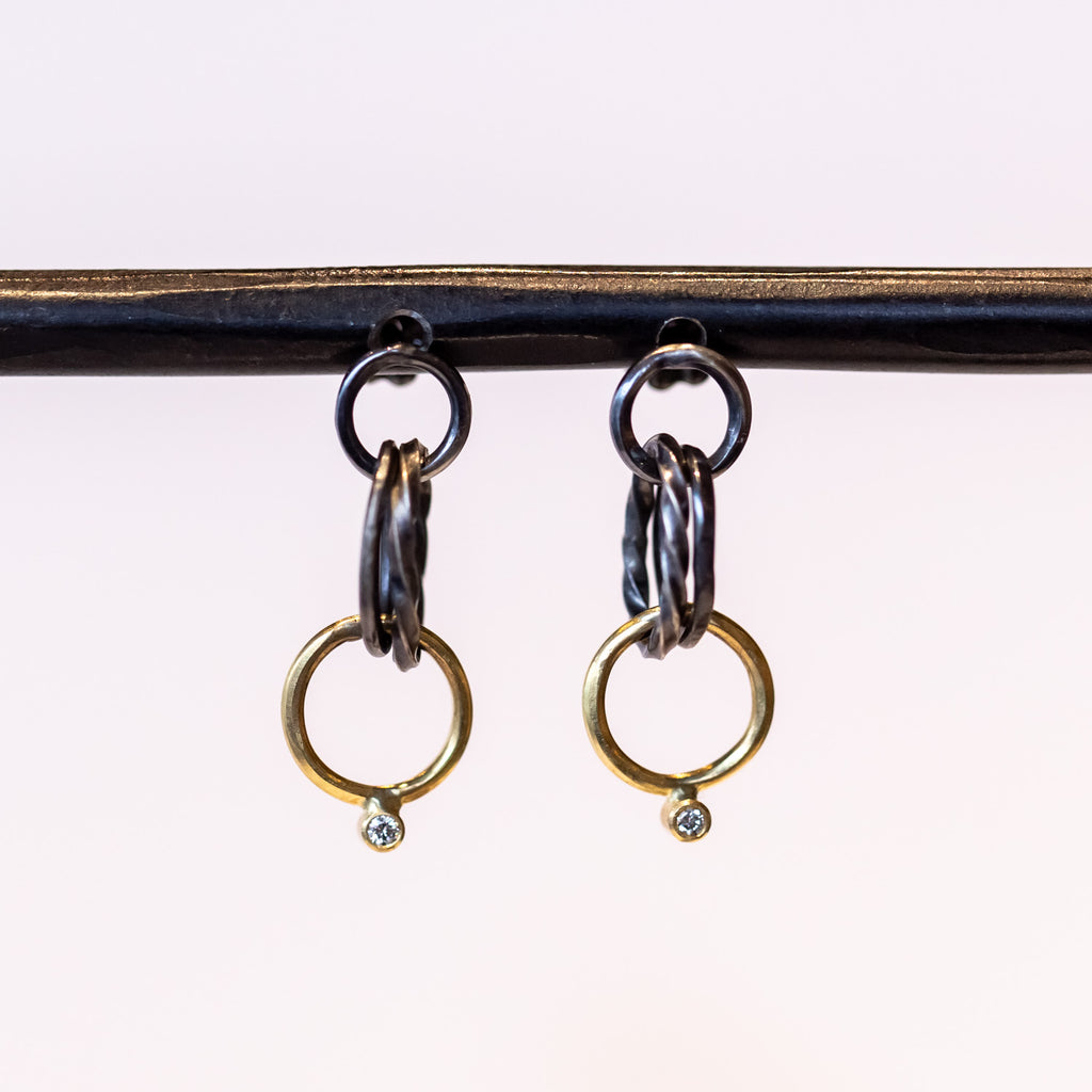 A little bit edgy, a little bit refined—these stud drop earrings strike the perfect balance. Handmade oxidized silver links create a sculptural, organic feel, while an 18k gold link adds warmth and contrast. A bezel-set white diamond at the base lends just the right amount of shimmer, making these the kind of gold earrings for women who love unique jewelry with a subtle sparkle. Understated yet full of character, they’re an effortless everyday go-to