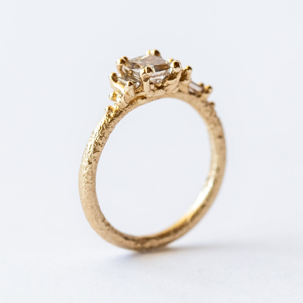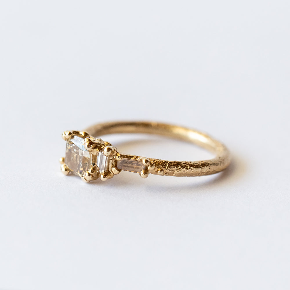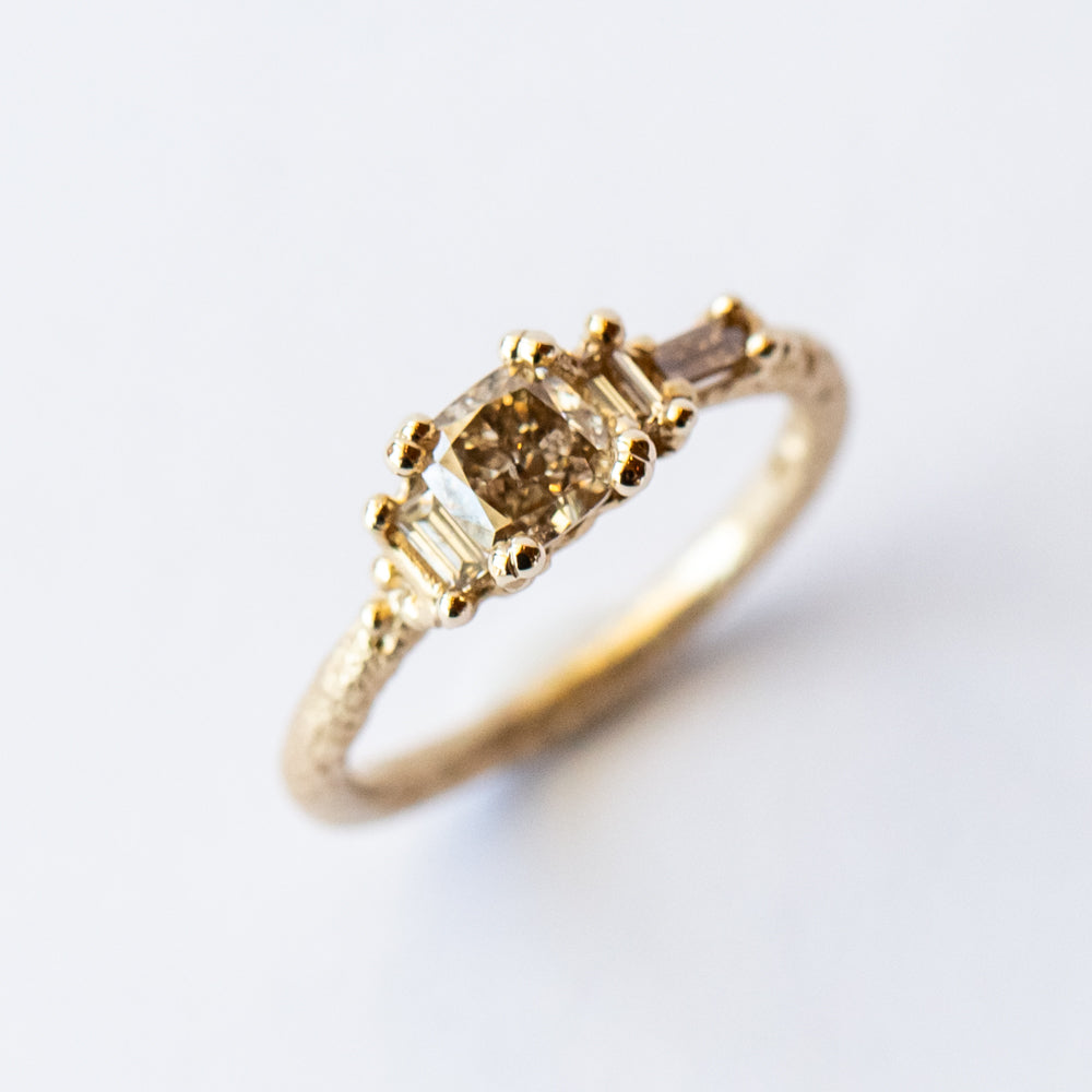 For a ring that feels like a love story whispered across decades, this champagne diamond engagement ring from Ruth Tomlinson is the ultimate statement. With a one-of-a-kind, cushion cut champagne diamond at its heart, this piece is all about the rich, moody sparkle that only a cushion diamond ring can deliver. The asymmetric cluster of baguette cut diamonds adds a hint of vintage glamour, while the gently textured 14k yellow gold band keeps things feeling earthy and organic—just the right balance of raw and refined.