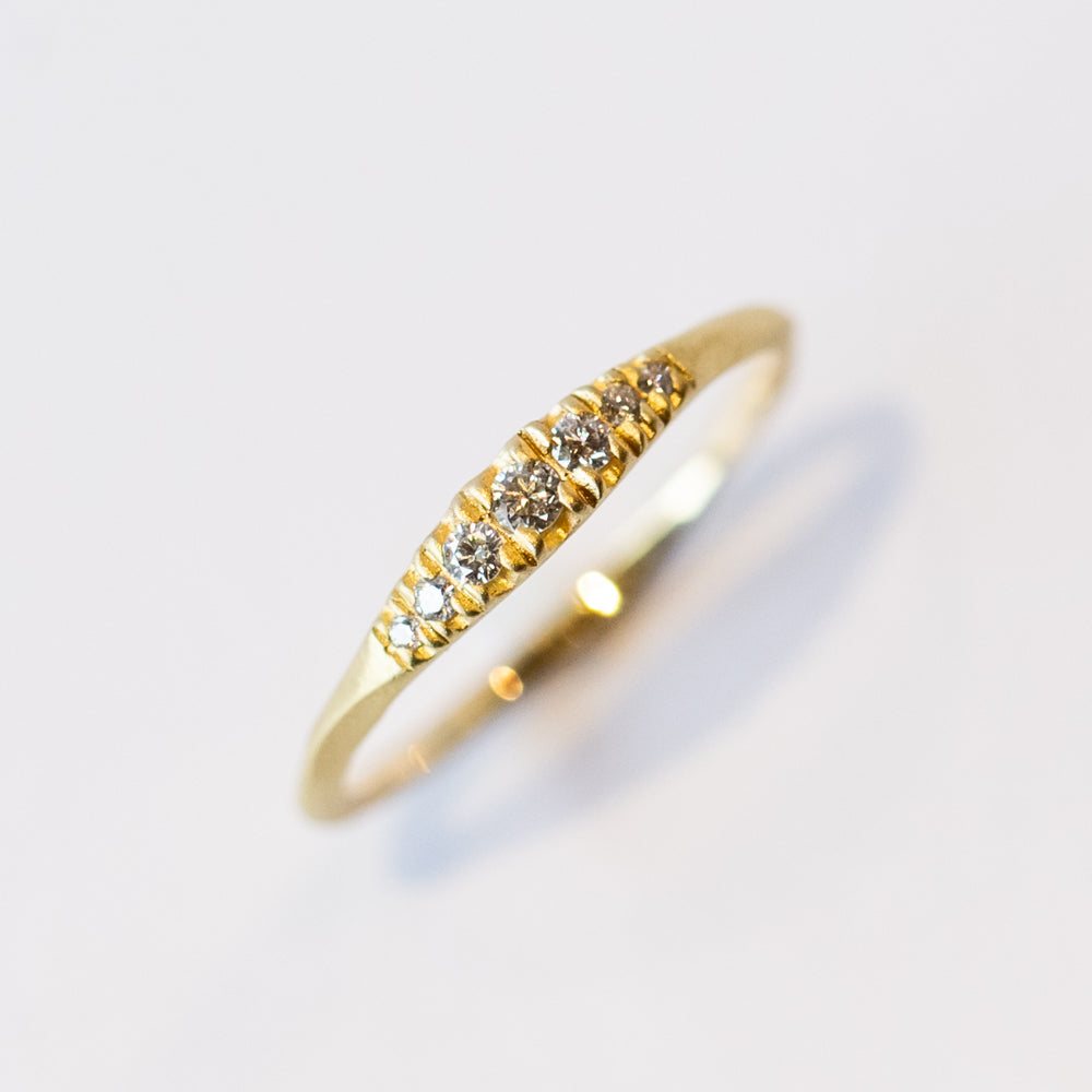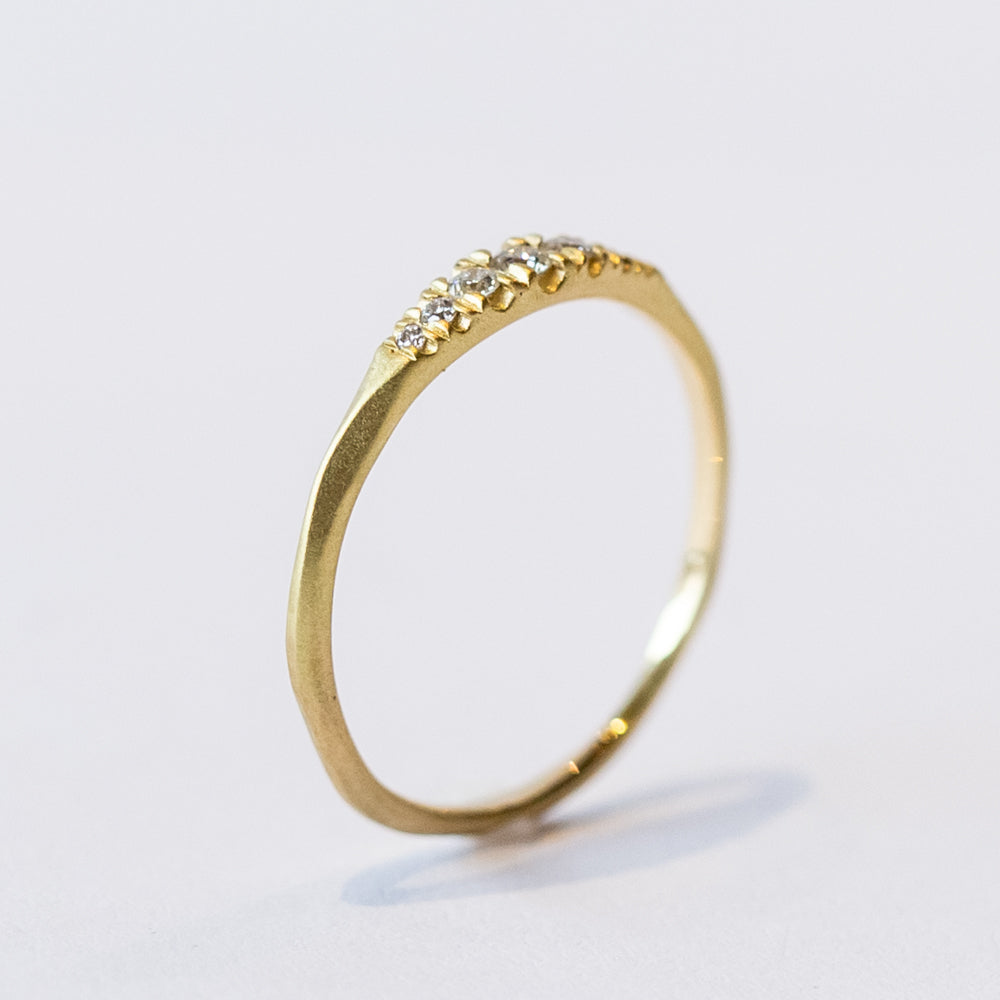 A dainty take on a classic silhouette, this petite pavé diamond band brings vintage charm with a modern edge. Inspired by Mt. Rubidoux in Riverside, California, its gently contoured shape nods to Victorian-era design while feeling effortlessly fresh. Crafted in matte 18k yellow gold, a row of graduated white diamonds shimmers across the top, adding just the right amount of sparkle. Perfect for stacking, as a delicate engagement ring, or paired with its bold counterpart, the Petite Diamond Trellis Band.