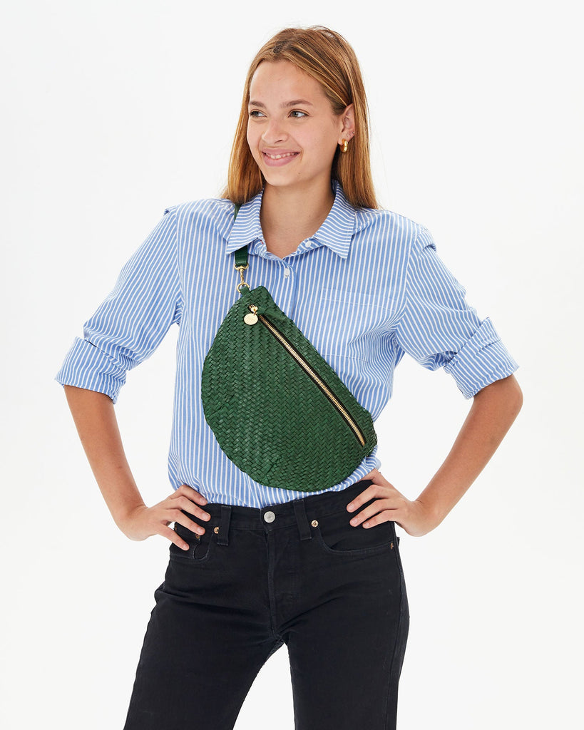 The grande fanny is big sister to our classic fanny pack. Three ways to wear - at the waist, across the body, or on the shoulder. Slim profile with surprising capacity. Detachable / adjustable / interchangeable strap. Leather is woven entirely by hand.