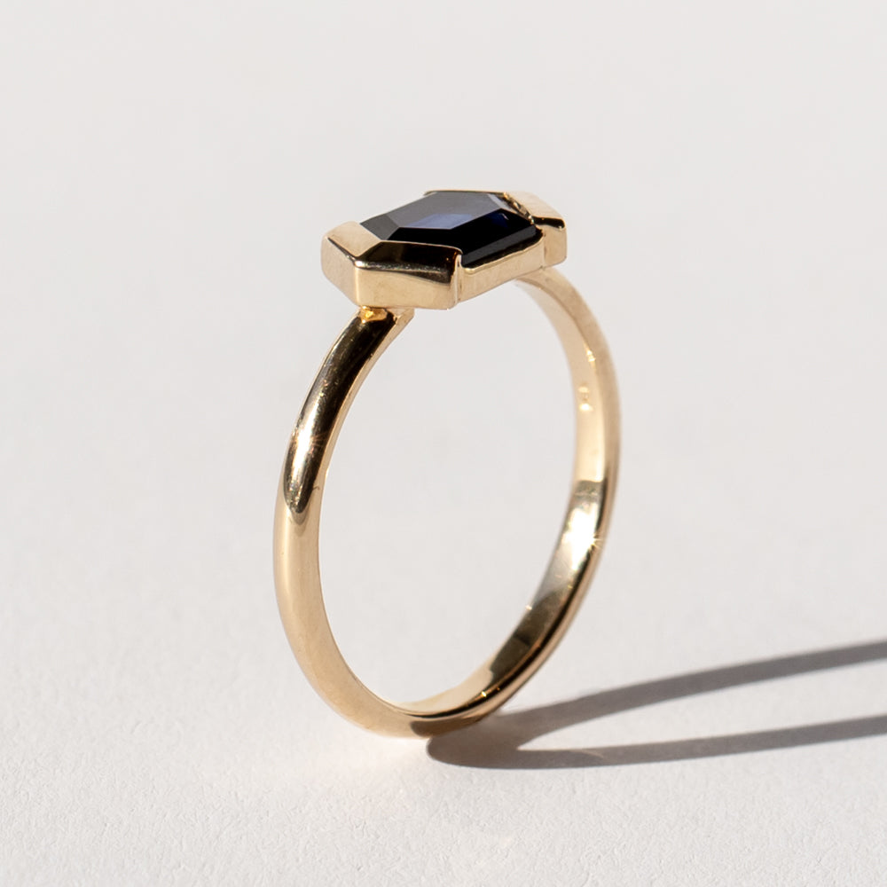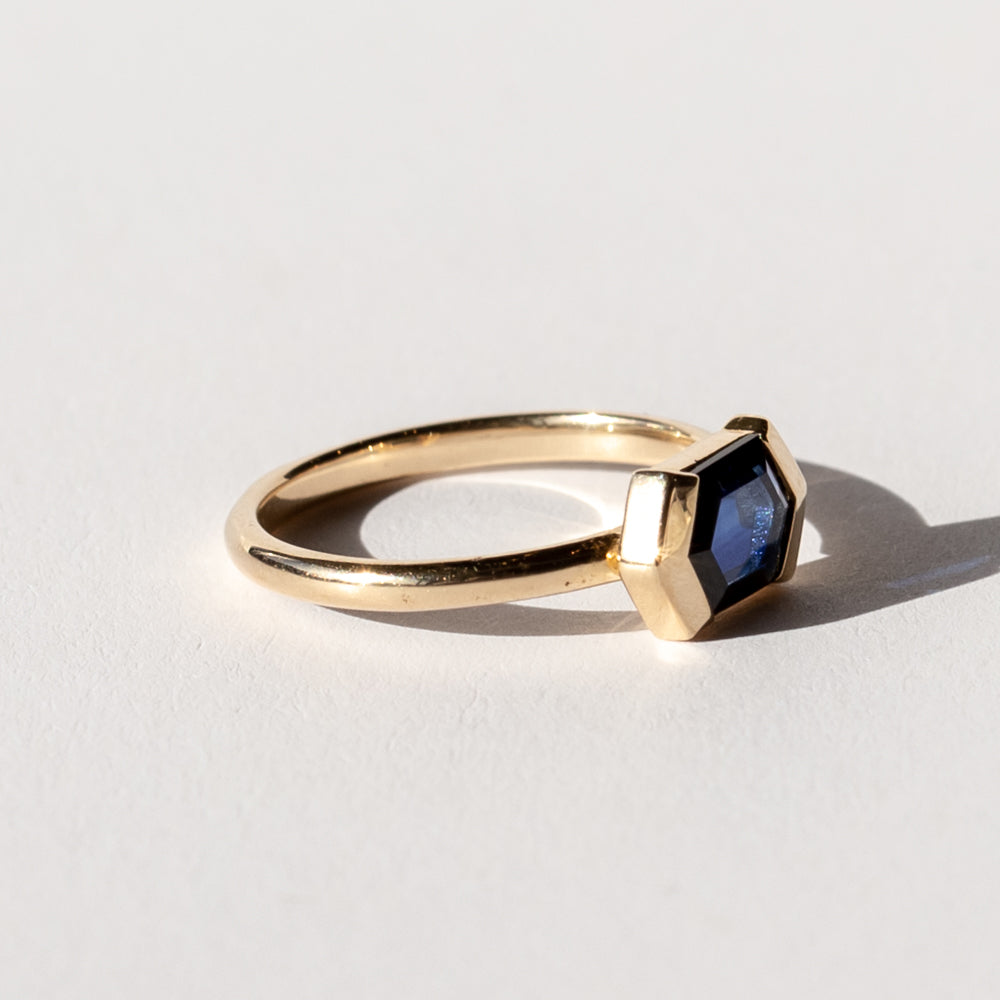 Elegant and edgy, this deep blue sapphire solitaire ring from Ladha is perfect for your everyday style. A unique hexagonal cut sapphire is set in a demi-bezel style (from two ends), leaving the sides open for a sleek, geometric look. The bright yellow gold is a beautiful contrast to the dark, moody gemstone. Gorgeous solo or as part of your ring stack.