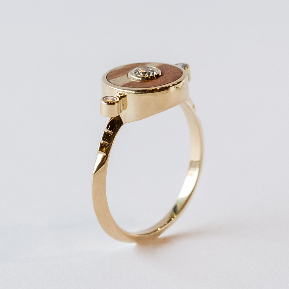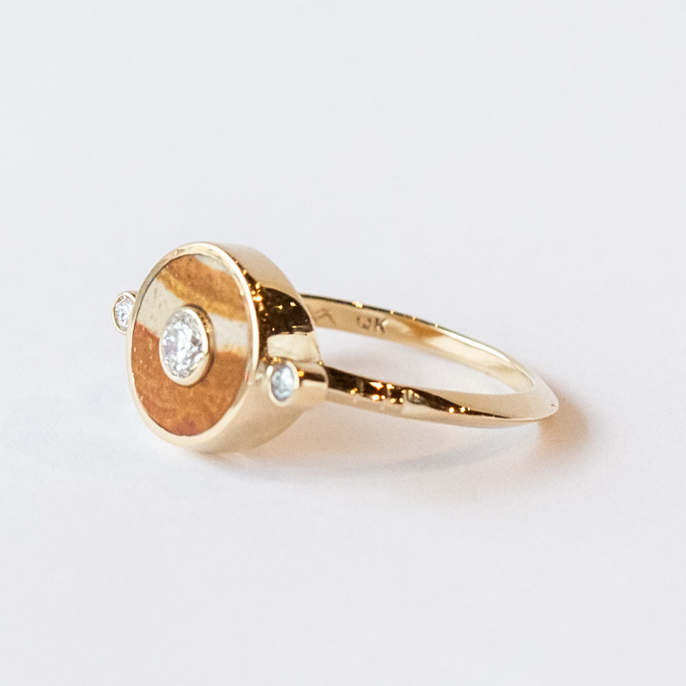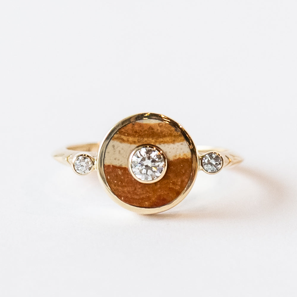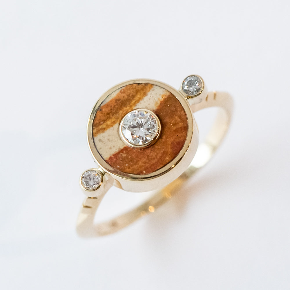 This eye-catching cocktail ring from Young in the Mountains features a naturally-striped orange and cream jasper set with a bright and shining .15 ct. white diamond at the center and bookended with two .03 ct. diamonds at each side.