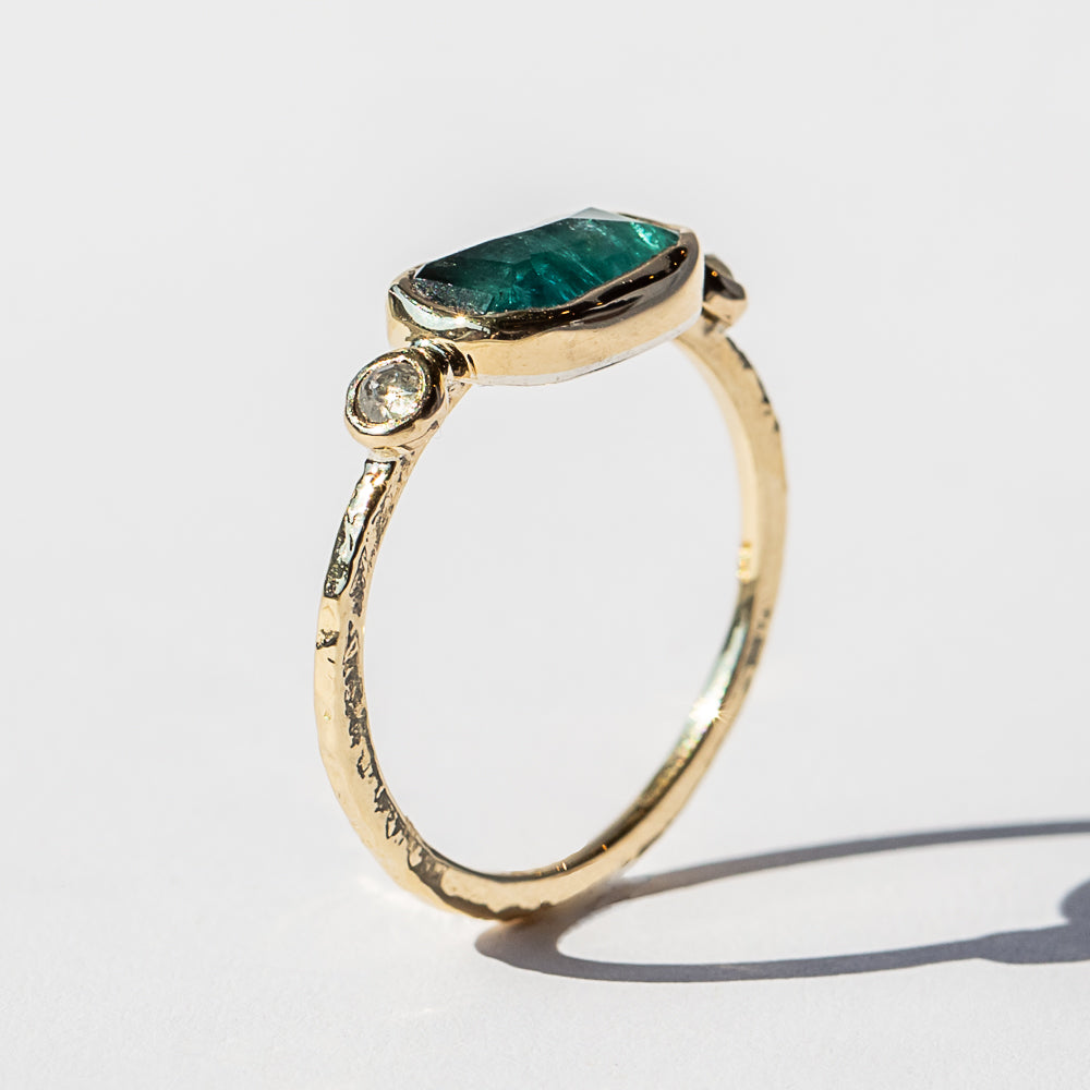 A vibrant teal tourmaline gives major color in this Emily Amey ring, accented with subtle salt-and-pepper diamonds for a hint of sparkle and texture. Set east-west in 14k yellow gold, the piece balances modern sophistication with organic character. Teal tourmaline is associated with calm, creativity, and self-expression, making this ring as meaningful as it is striking. Wear it solo to let the stone shine or layer with delicate gold bands for a personalized stack.