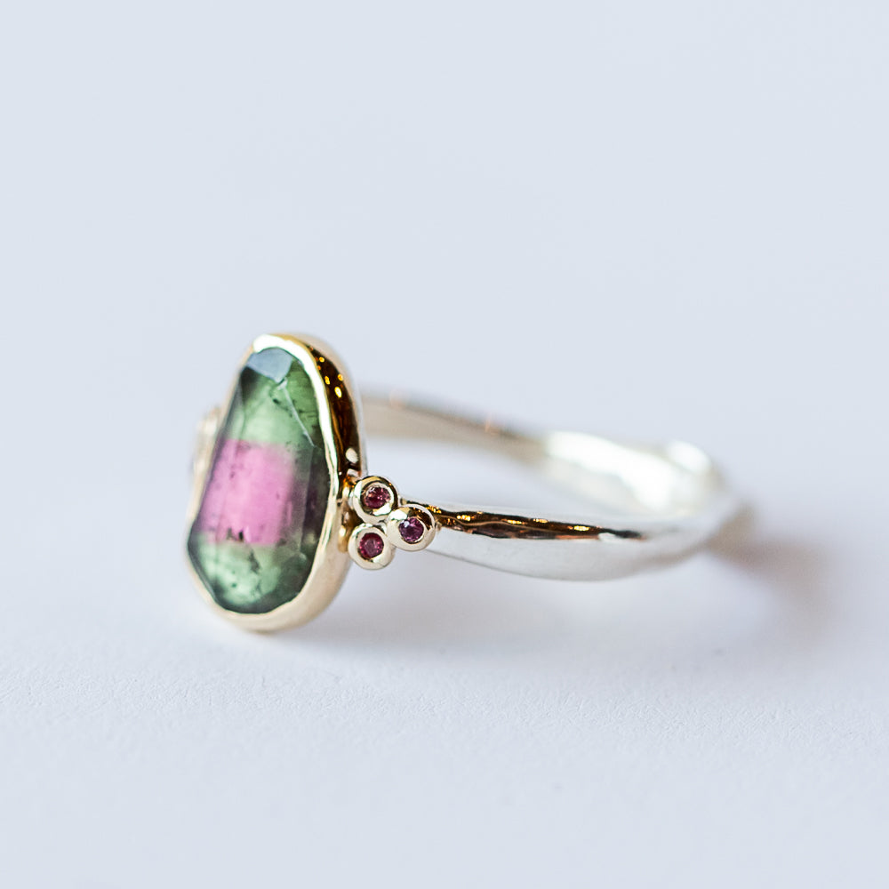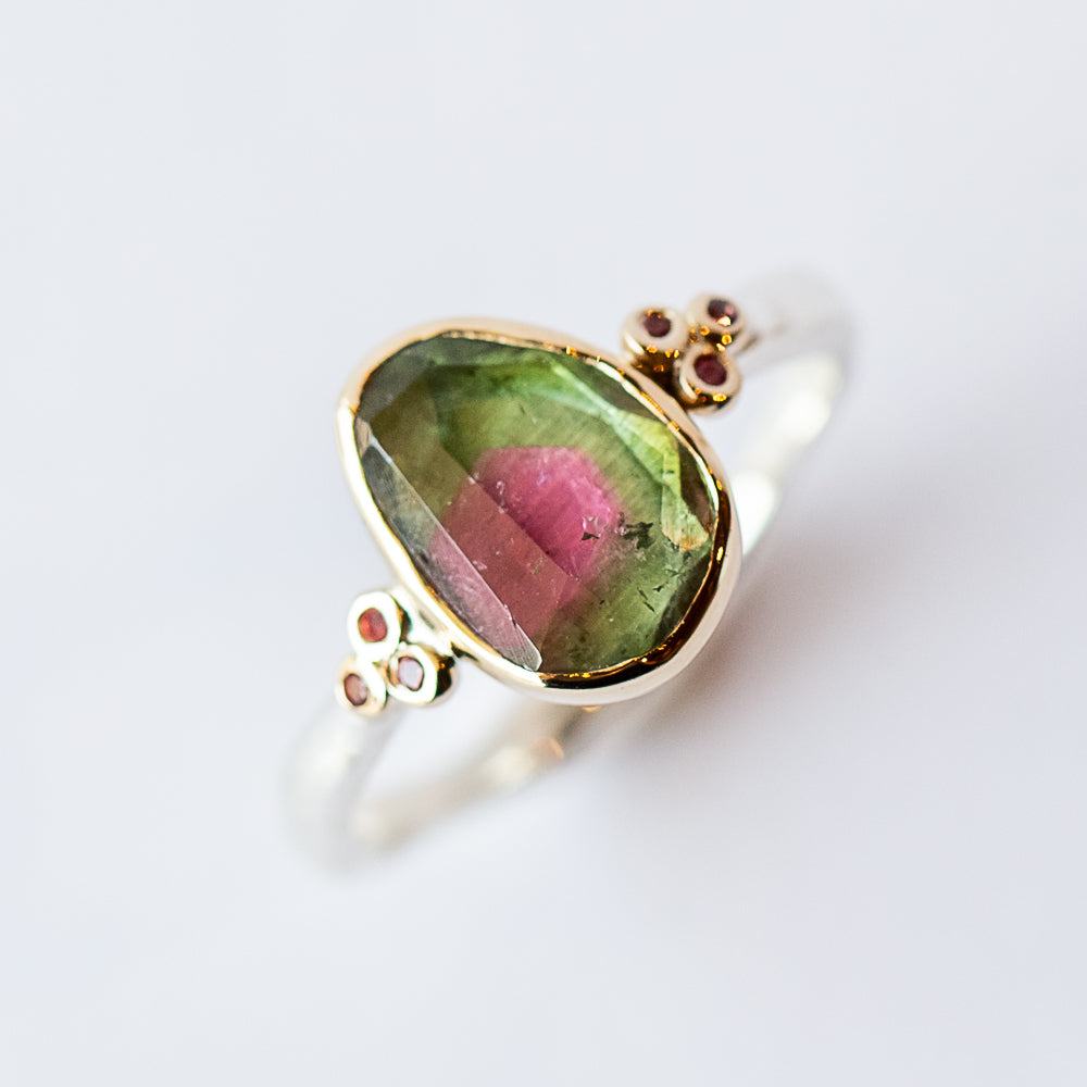 A gorgeous watermelon tourmaline is the heart of this Emily Amey ring, flanked by dainty padparadscha sapphires for a playful, colorful look. Set in 14k yellow gold and sterling, the piece balances whimsy and elegance. Watermelon tourmaline symbolizes balance and joy, while padparadscha sapphires bring warmth and unique sophistication. Wear it solo as a bold statement or layer with other gold and silver rings for a stacked look.