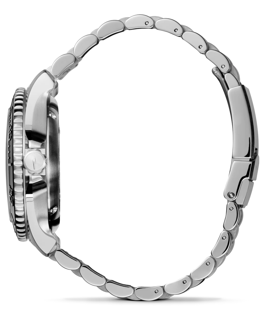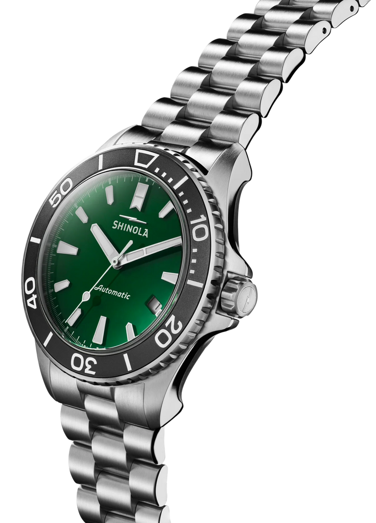 This 43mm Shinola Monster hits the mark when it comes to a dive watch you can trust. Its technical acumen makes the iconic aesthetic of Shinola an added bonus. Powered by the SW 200-1 automatic movement, which features 26 jewels and 38-hour power reserve, this high-grade 316 stainless steel timepiece is meticulously engineered to withstand extreme pressure and has a depth rating of 1,000 feet. With a durable, anti-reflective sapphire crystal and an anti-magnetic shield, the Shinola Monster is designed specifically with divers in mind. The unidirectional bezel keeps track of precious time underwater, and the stainless steel three-link bracelet with micro-adjustable clasp provides a secure fit while diving. While it's green dial reminds us of the beautiful forests and wildlife along Lake Ontario.