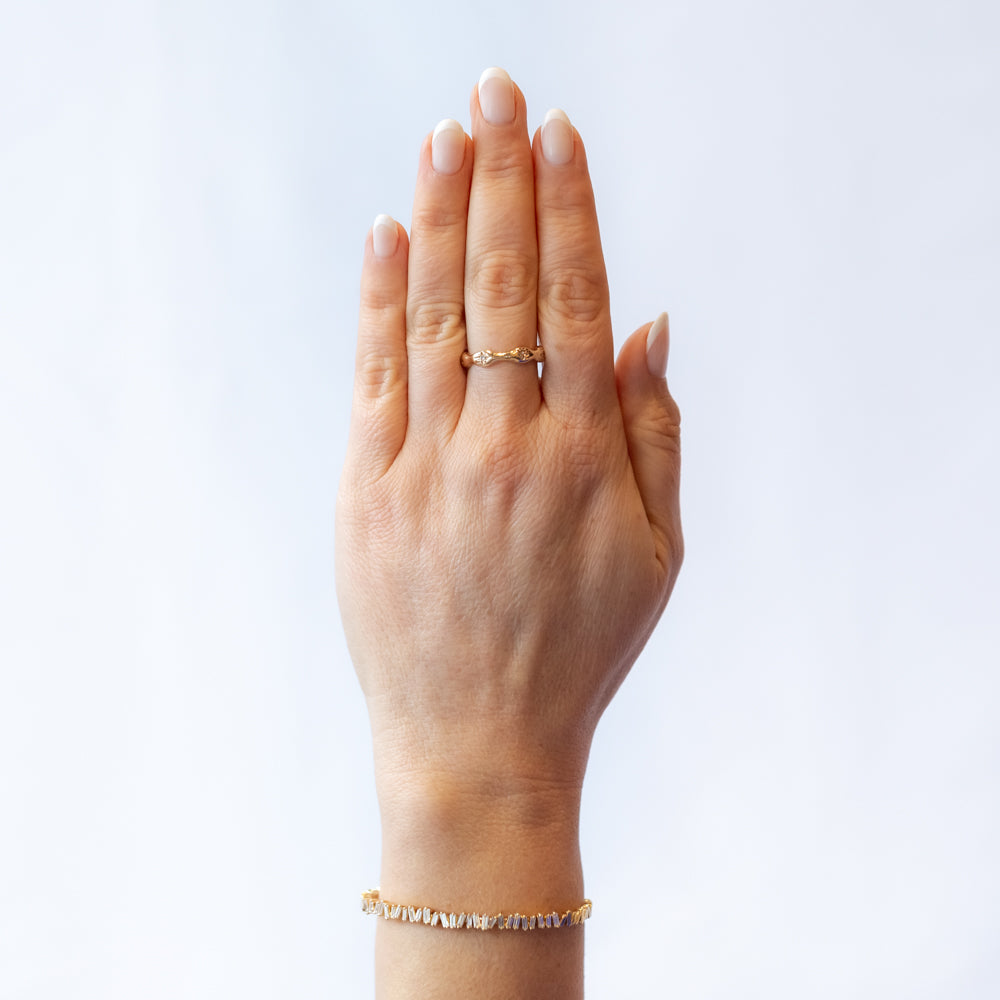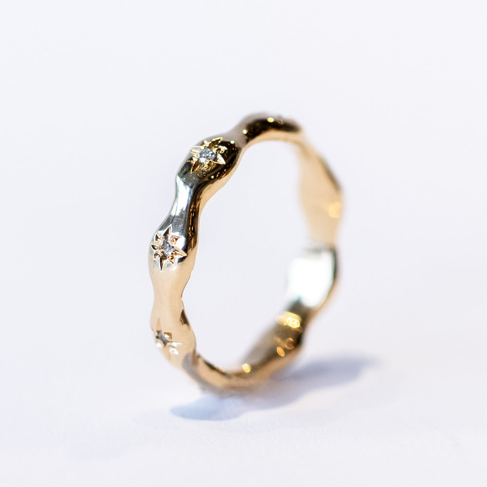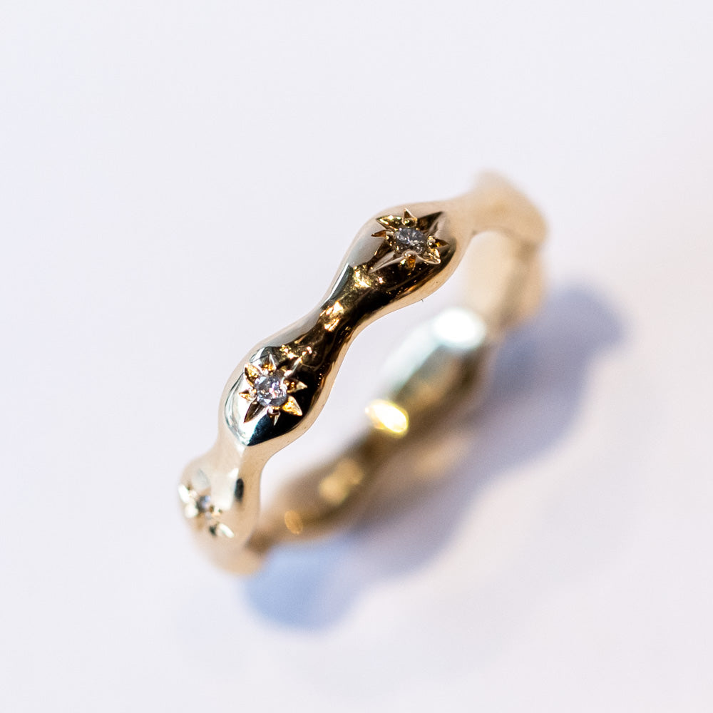 This 14k gold band brings a little extra sparkle with its wavy, fluid design. The tiny diamonds star-set into each wave are like little bursts of light, adding just the right amount of shine without going over the top. Whether you're wearing it on its own or stacking it with your other favorites, this diamond eternity band has the perfect balance of modern flair and timeless style. Let it catch the light and make your look pop—every wave sparkles with a story.
