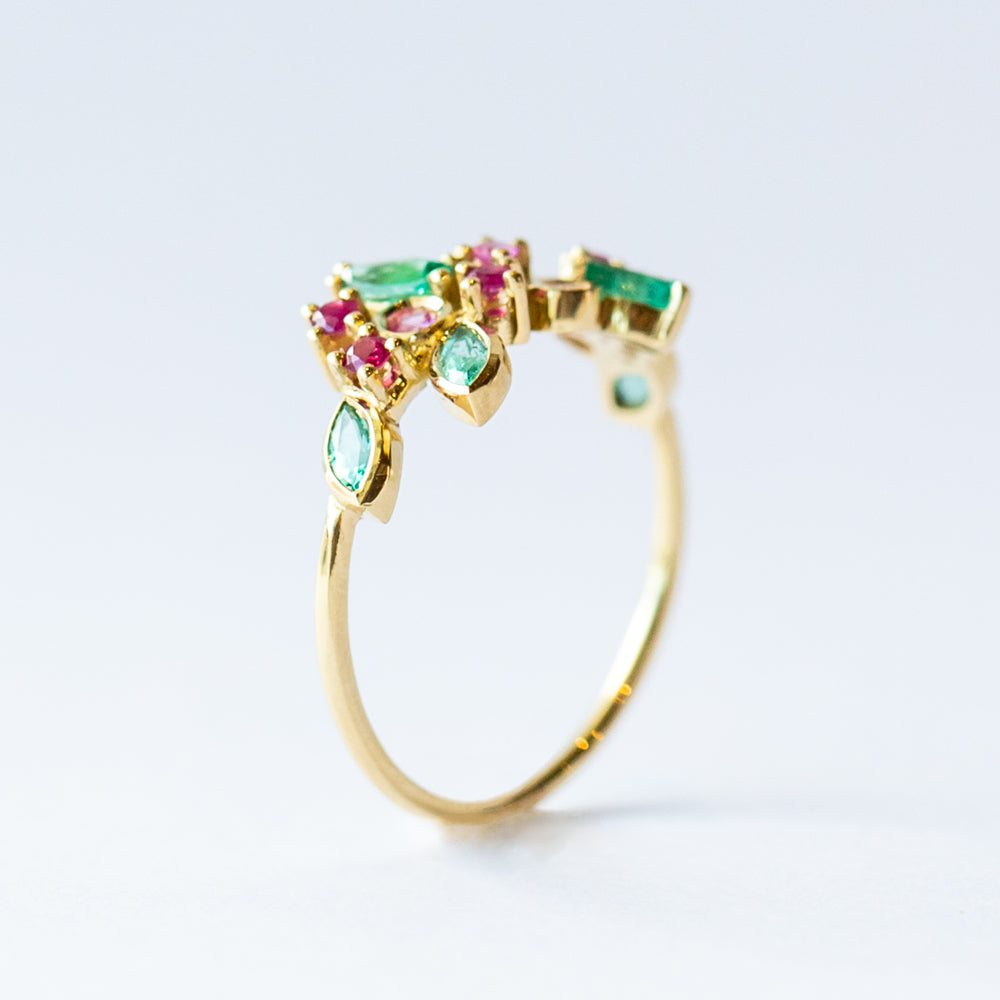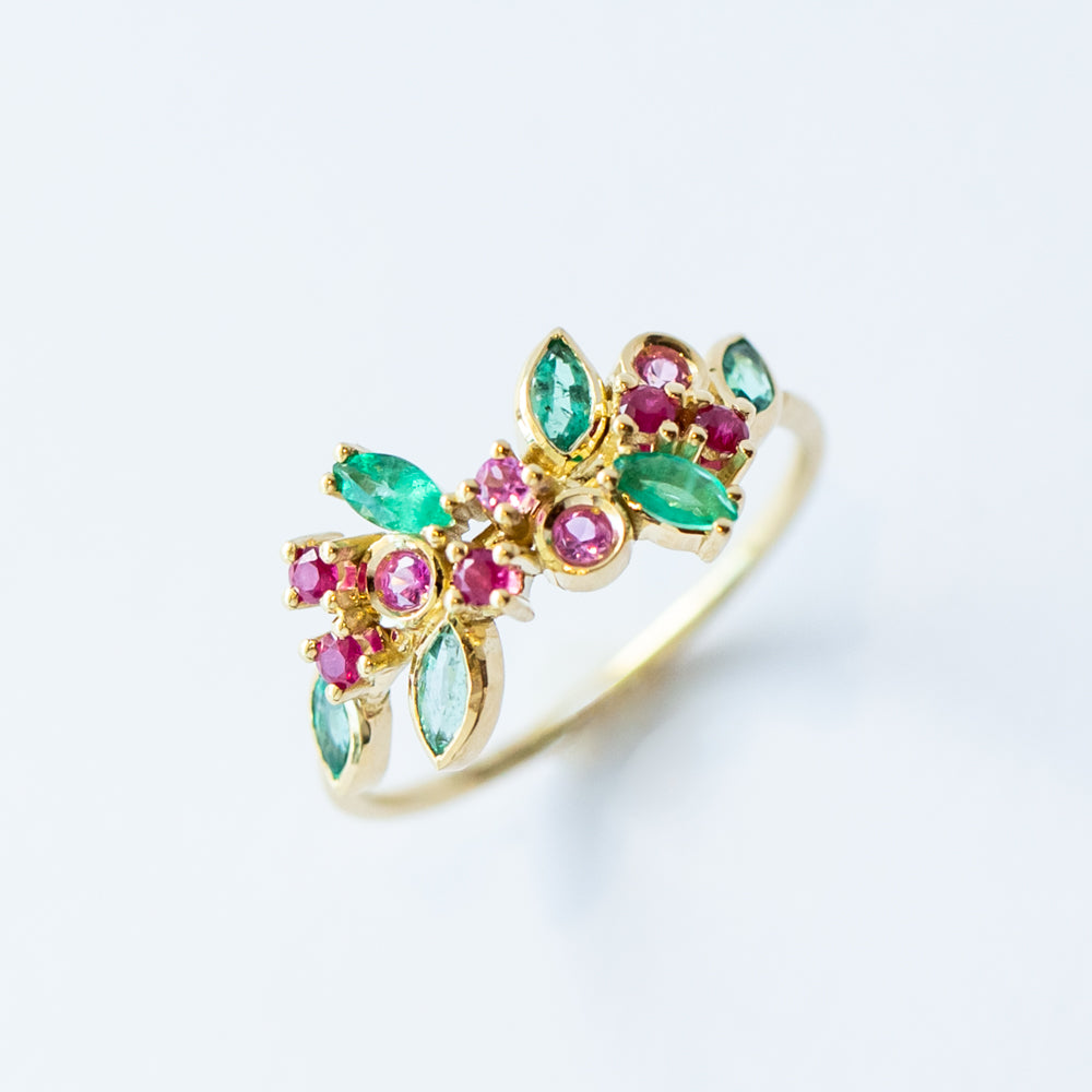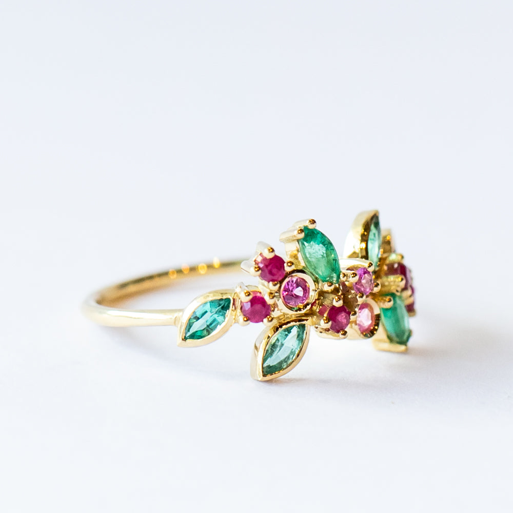 Set in rich 18k yellow gold, this floral arrangement is bold but balanced, soft yet striking. Rubies bring heat (and passion—hi, July babies), pink sapphires add a playful sweetness, and emeralds offer heart and harmony, with a wink to May birthstones.