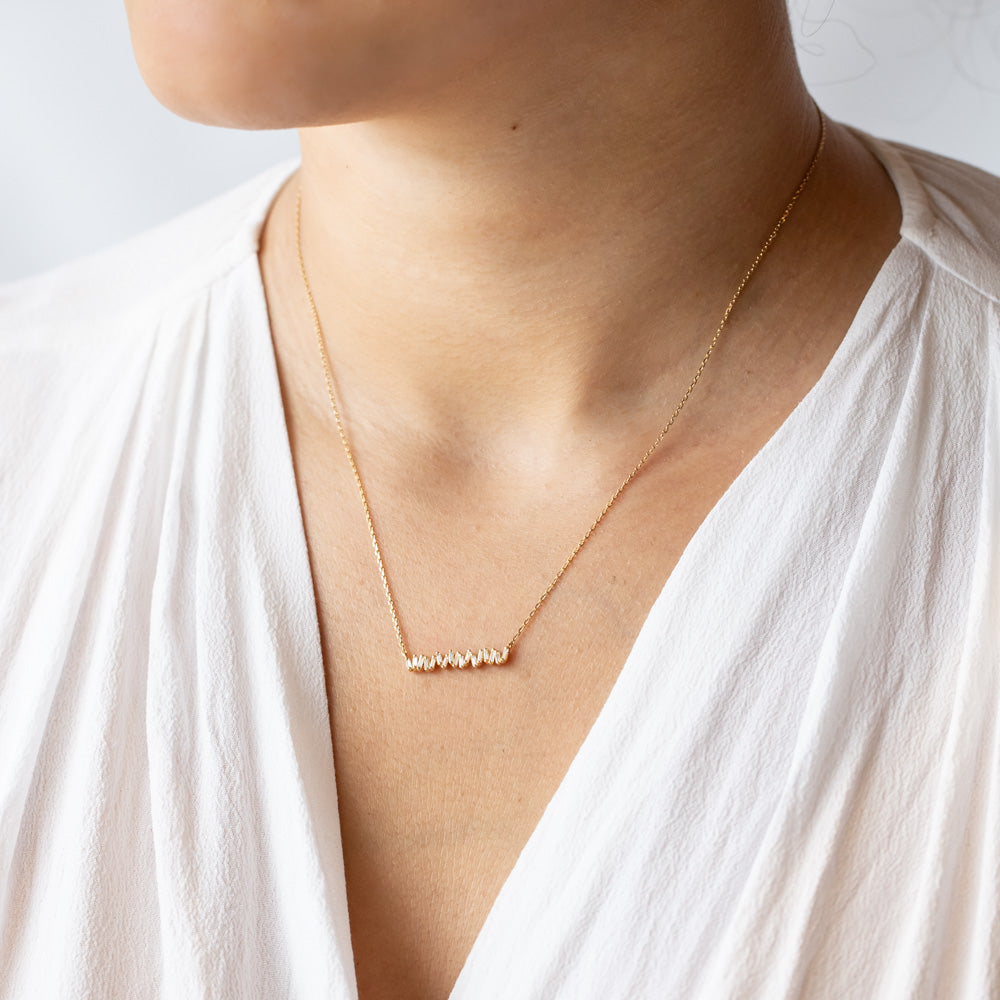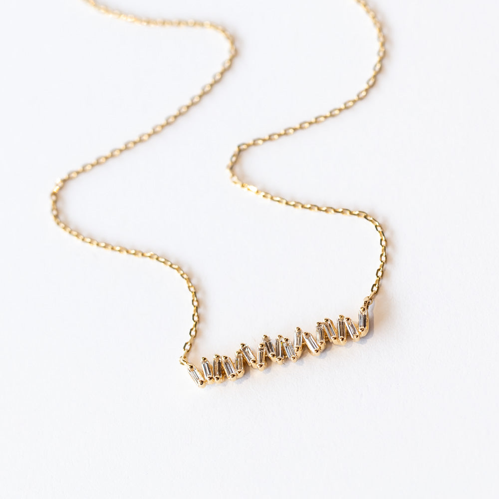 With 0.30 carats of radiant baguette-cut diamonds, this necklace is designed for effortless everyday wear. Its sleek, contemporary silhouette makes it perfect for layering with other gold necklaces or wearing solo as a refined statement piece.