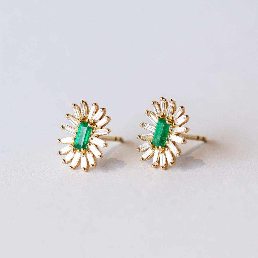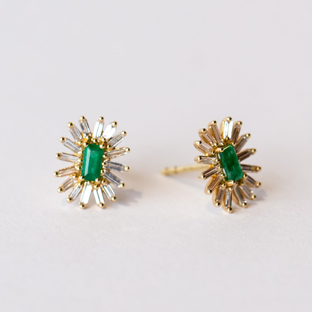 Elevate your collection with these stunning emerald earrings from Suzanne Kalan. Featuring bold baguette-cut emeralds surrounded by staggered baguette white diamonds, these emerald and diamond studs are designed to capture attention and add a touch of sophistication to any look. Set in Suzanne’s signature Fireworks design, the combination of rich green emeralds and sparkling diamonds creates a truly unforgettable statement.