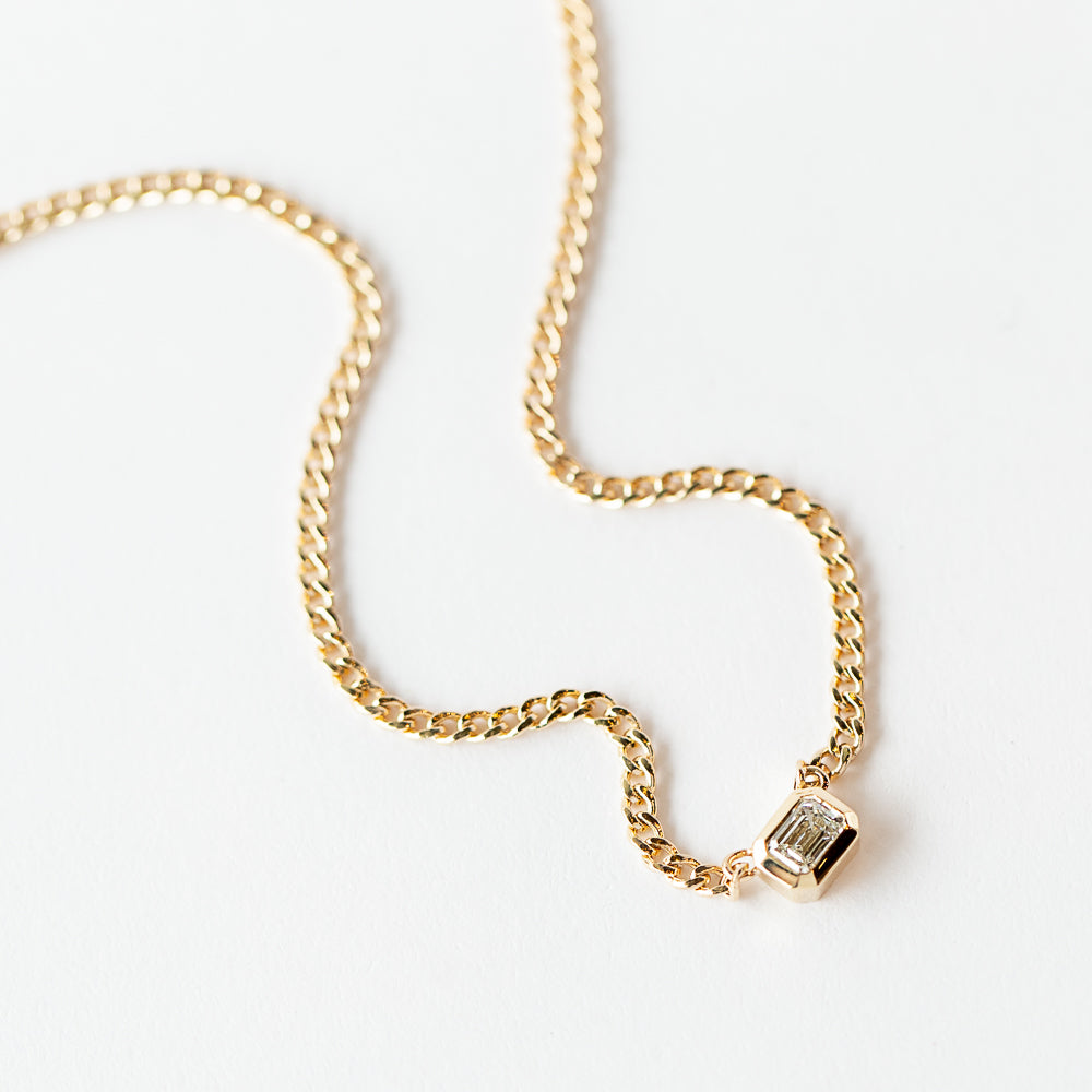 Minimal but major. This 14k yellow gold chain necklace features a single emerald-cut diamond in a modern, sleek bezel for just the right mix of modern geometry and classic sparkle. The adjustable length makes it a layering essential or a simple statement all on its own.