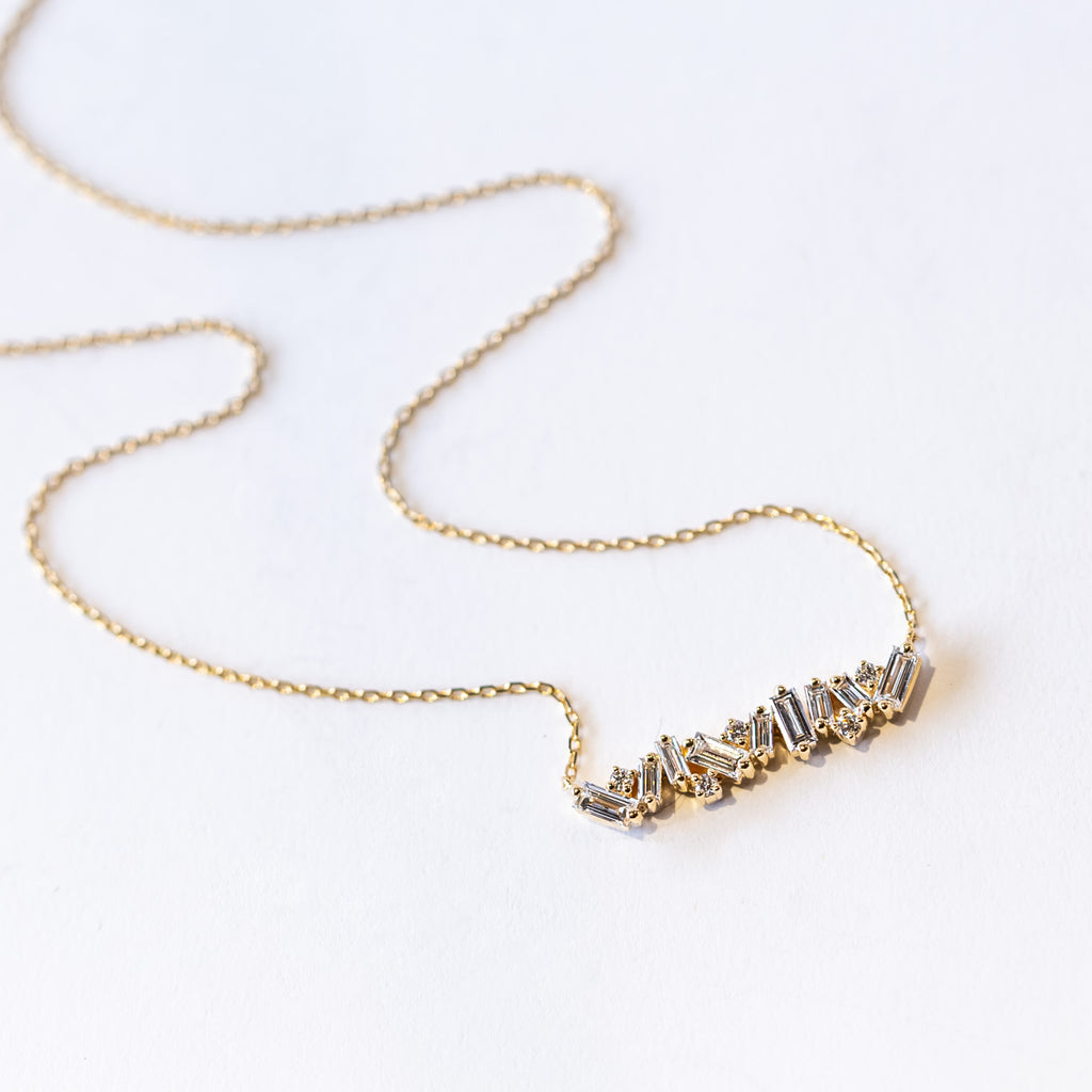Featuring 0.67 carats of baguette diamonds and 0.10 carats of round diamonds, this piece brings effortless luxury to any jewelry collection. Its adjustable 16- to 18-inch chain makes it perfect for layering with other gold necklaces or wearing solo as a refined focal point.