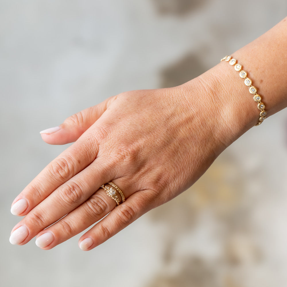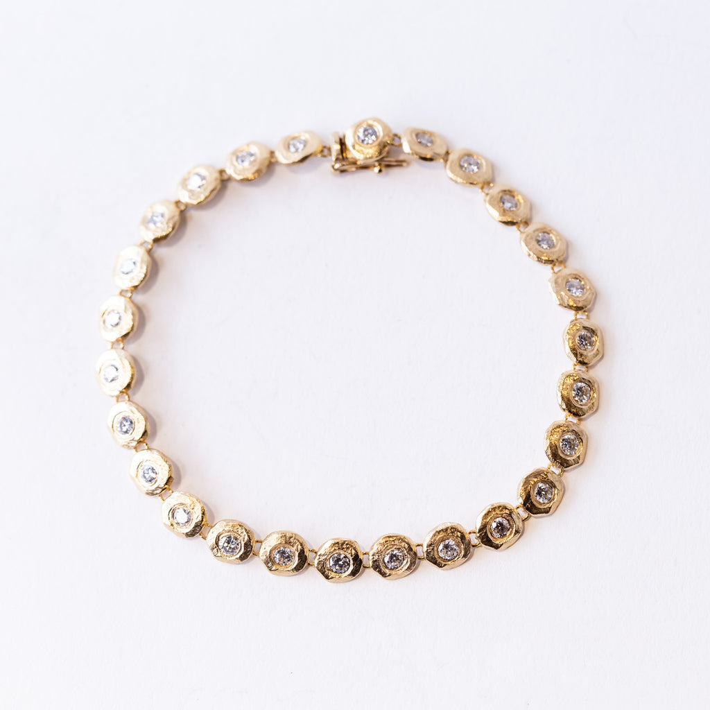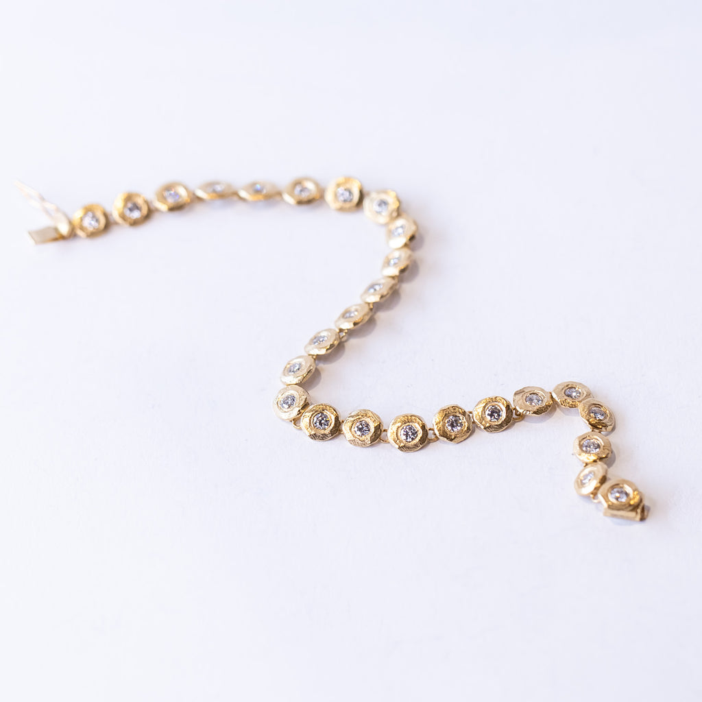 For some nonstop sparkle that's oh so sophisticated, reach for this diamond tennis bracelet. It takes the classic tennis bracelet idea—an endless line of diamonds around your wrist—and transforms it with designer Page Sargisson's signature hand carved texture. More than a carat and a half of brilliant white diamonds are set into wide, detailed bezels that lie flat against your skin for a look that's as bold as it is timeless. Wear it alone for a subtle statement or stack it with other bracelets in your collection for a on-trend look.