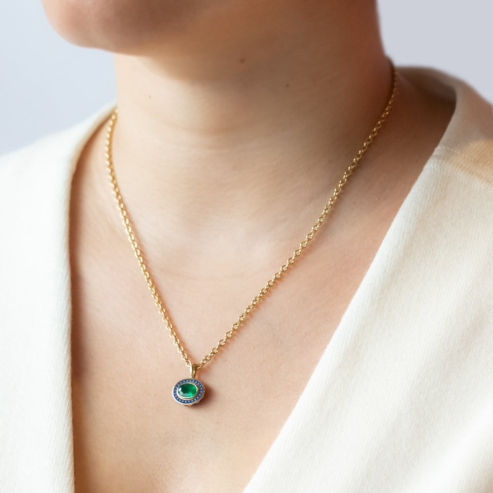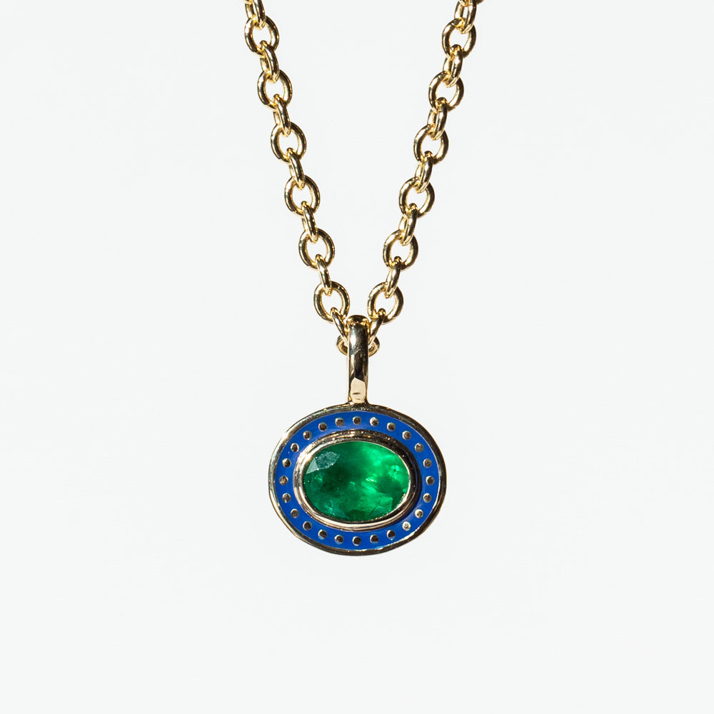 This 14k yellow gold pendant from designer Kathryn Bentley showcases a vibrant natural emerald, elegantly framed with intricate enamel adornments. Paired with a chunky gold box chain, this piece embodies refined beauty and symbolic meaning. Emerald, the birthstone of May, represents rebirth, renewal, growth, and true love—making it a meaningful addition to your jewelry collection or a heartfelt gift.