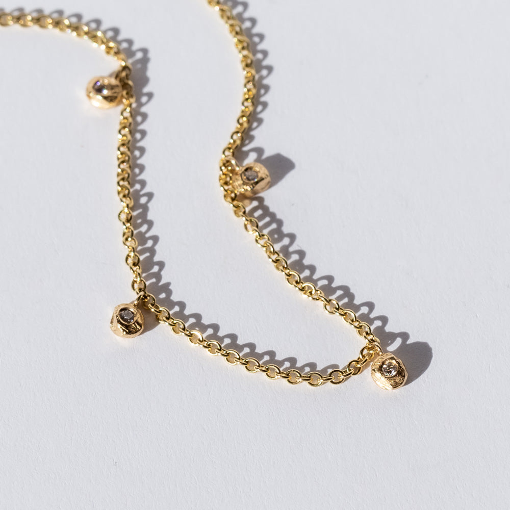 Five dangling white diamonds bezel set in hand carved 18k yellow gold