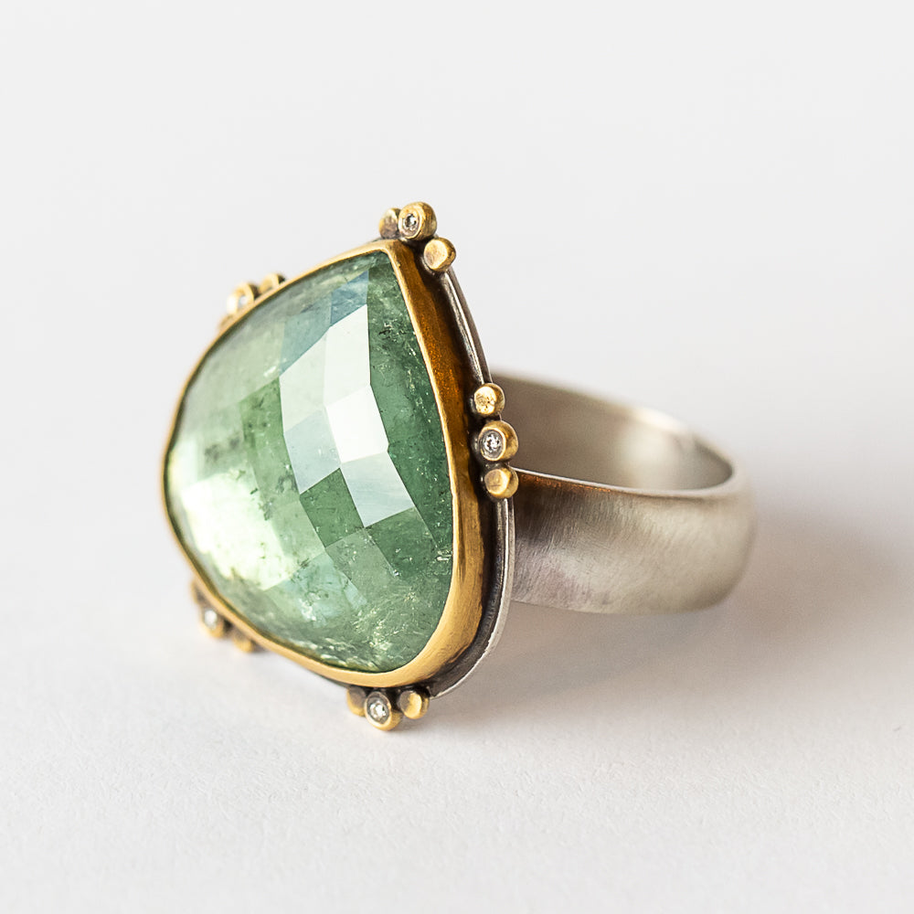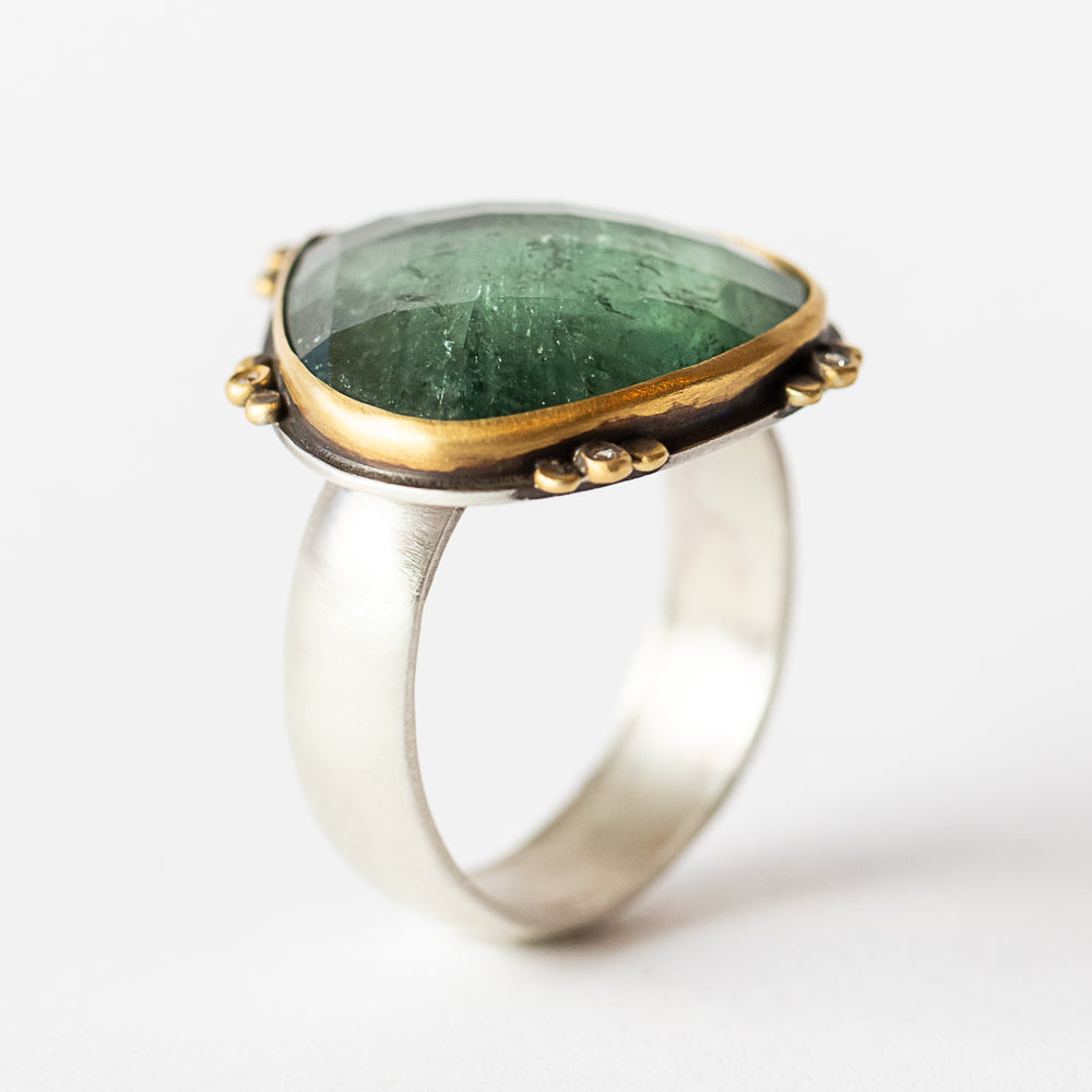 This Ananda Khalsa ring centers on a luminous pear-shaped tourmaline in a dreamy blue-green shade, wrapped in a warm 22k yellow gold bezel over sterling silver. The stone’s soft glow is offset with clusters of gold and diamond dots along its circumference, giving just a hit of sparkle without distracting from the gem’s presence. A wide silver band gives it substance and balance.