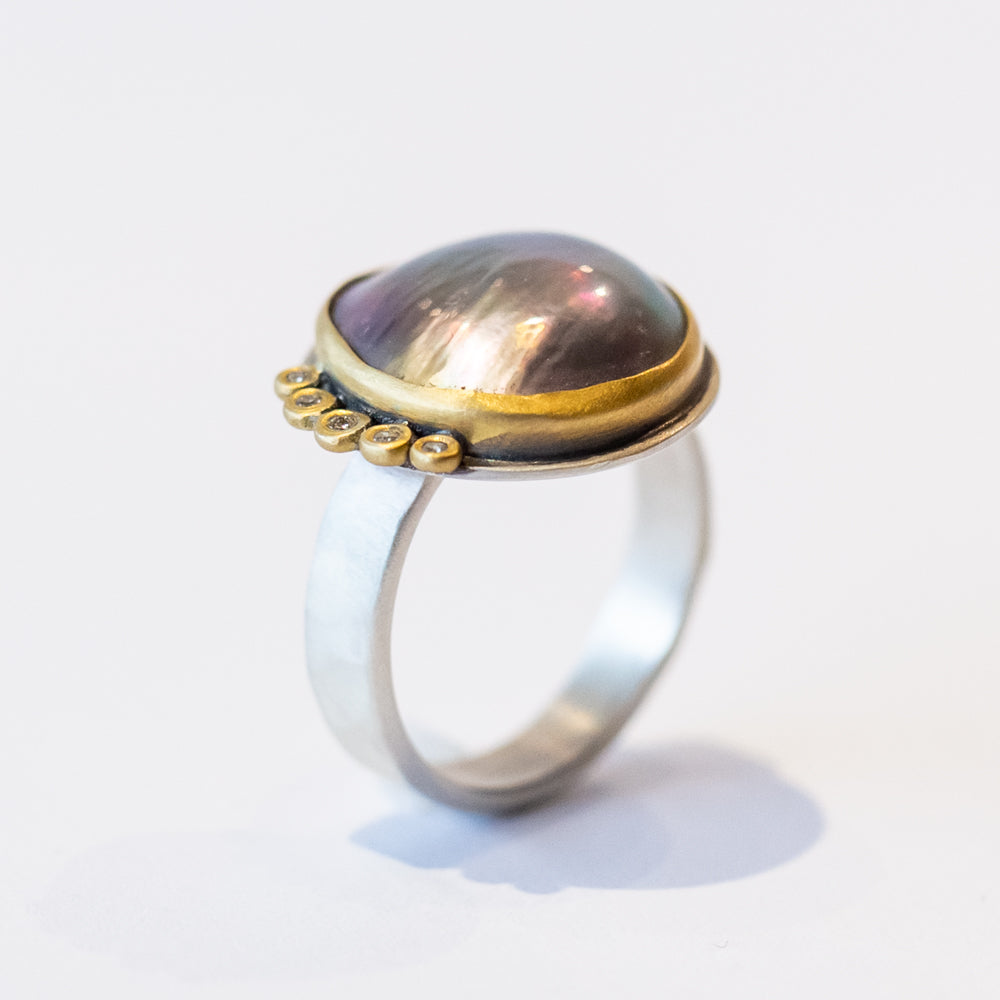 This statement-making ring is all about drama in the best way. A large, luminous Tahitian Mabe pearl takes center stage, its inky, iridescent sheen shifting between deep greens, blues, and purples like the ocean at midnight. Framed in a warm 22k gold bezel and set on a sterling silver band, this piece brings just the right mix of bold and refined. Five sparkling diamond accents add a touch of celestial magic—like tiny stars orbiting a glowing moon. Tahitian pearls symbolize wisdom, protection, and transformation, making this a perfect piece for someone stepping into their power.