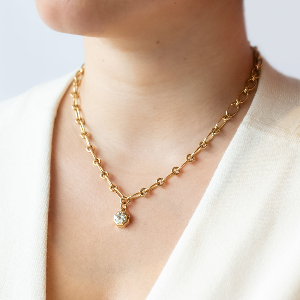 Meet your new favorite accessory: an 18k yellow gold diamond necklace that’s equal parts timeless and showstopping. The 1.54ct old European cut diamond (hello, vintage vibes!) glows with a warm K color and sparkling SI2 clarity, making it the kind of piece that demands compliments without even trying. Suspended on a chunky gold 17-inch chain, it sits just right—like it was made for you. (Spoiler: it kind of was.)