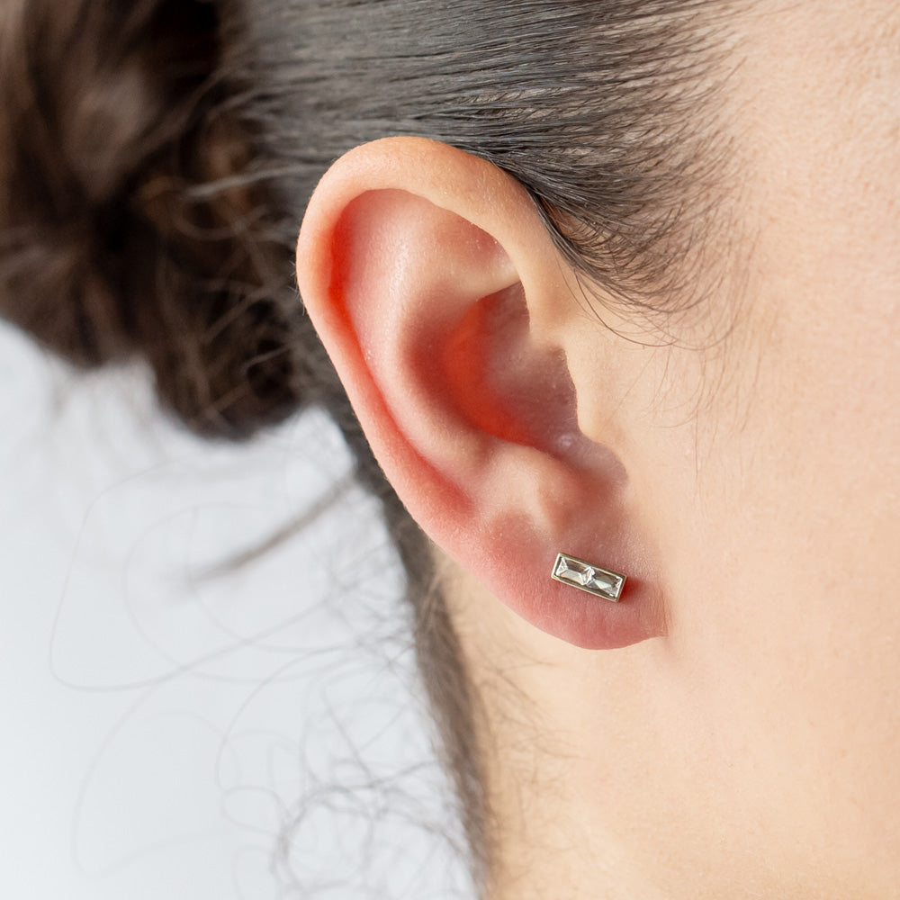 Elegant and modern, these Monet diamond stud earrings from Single Stone add a touch of subtle sparkle to any look. Each stud in the pair of earrings features two French cut diamonds set end-to-end in a handcrafted 18 karat white gold bezel. They are secured with post and push backs, and will be a pair of classic diamond stud earrings you reach for time and again.