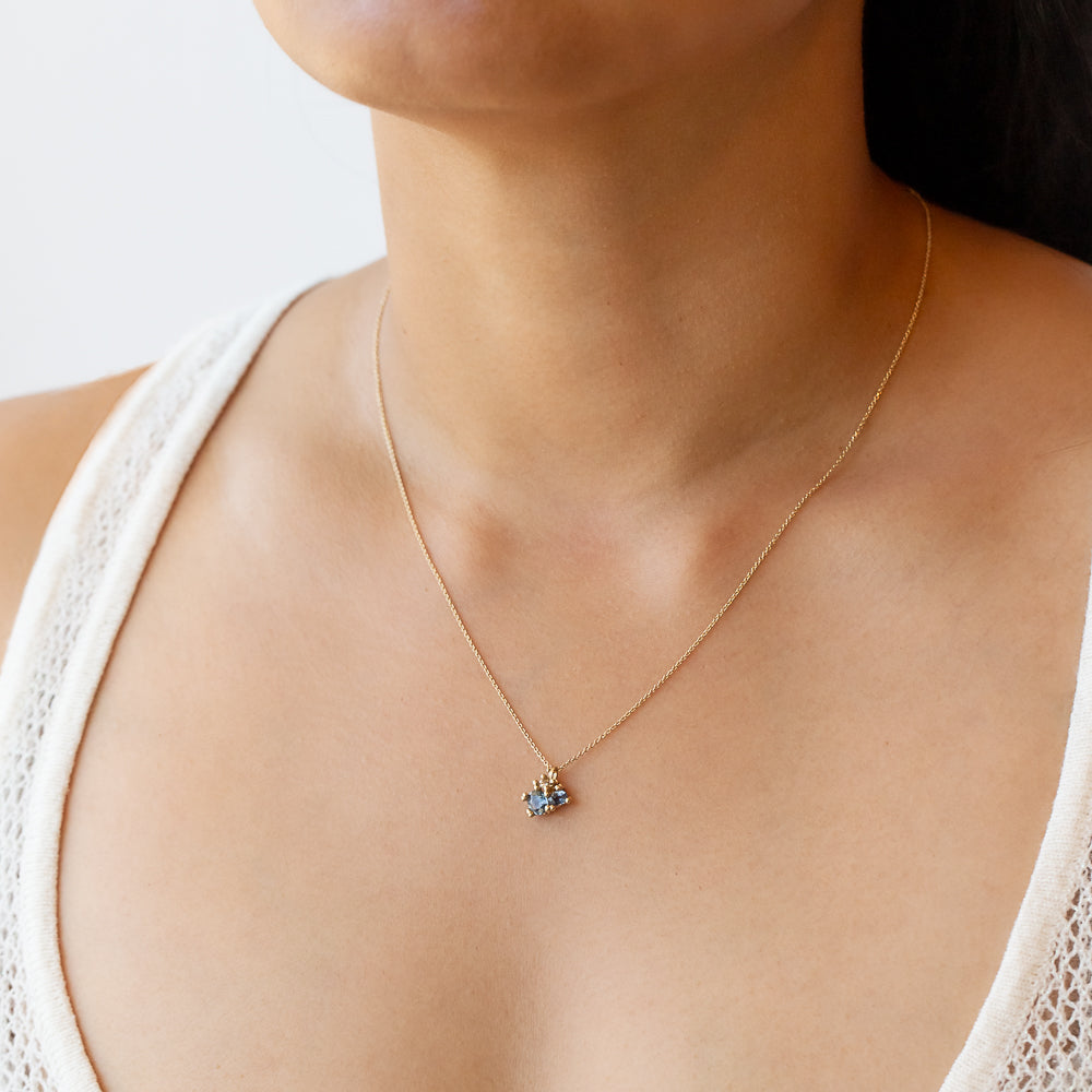 This sapphire cluster pendant necklace from Ruth Tomlinson is the perfect mix of organic design and refined sparkle. Featuring a cluster of oval cut sapphires, each stone is nestled among polished granules of 14k yellow gold, creating a rich, textured backdrop that feels like a tiny piece of wearable art. Topped with a single white diamond for just a hint of extra shine, this sapphire pendant is the kind of piece you’ll reach for whether you’re dressing up or just adding a little color to your everyday.