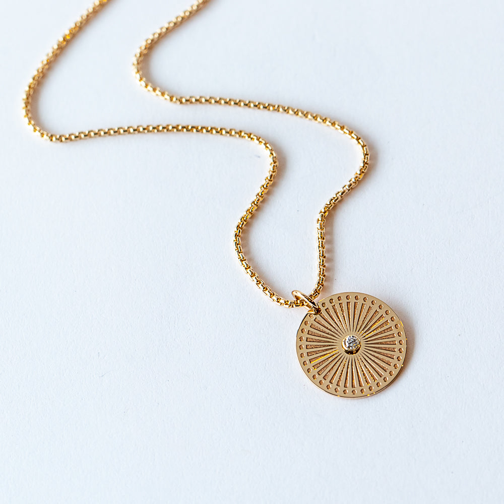 Designer Zoe Chicco hits the mark with this gold medallion necklace. Engraved with rays like a sun, with a dainty bezel-set diamond at its center, this modern classic is finished with a dainty gold box chain. Beautiful alone or layered with other necklaces to create your own look.