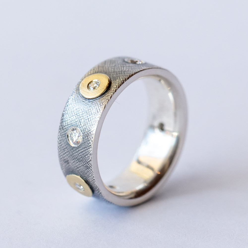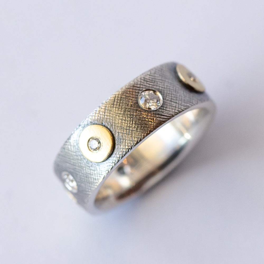 At 6mm wide, this wedding band has that perfect “I’m here to make a statement” presence. The contrasting textures and metals bring a little edge to the classic diamond band, making it a go-to for anyone who’s tired of the same old same old.