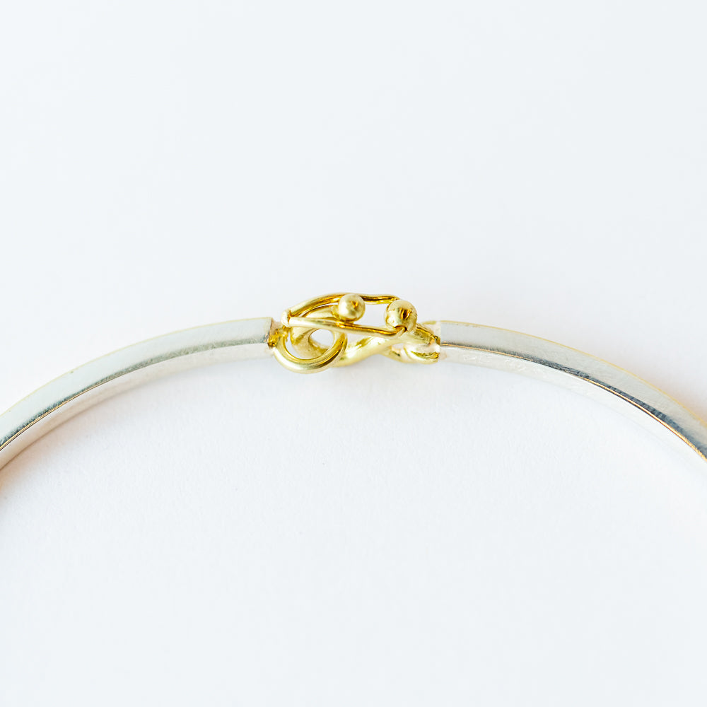 Sensuous meets edgy in this statement-making bangle bracelet from designer Rene Escobar. Handcrafted in the designer's signature mixed metals, it features a central link where a lustrous South Sea pearl is secured between two diamond rondelles. The silver arms extend in the round to meet a yellow gold clasp. It's a beautiful piece whether you wear it alone for a dressed-up event or mix it with other chain and diamond bracelets for a casual, layered look.