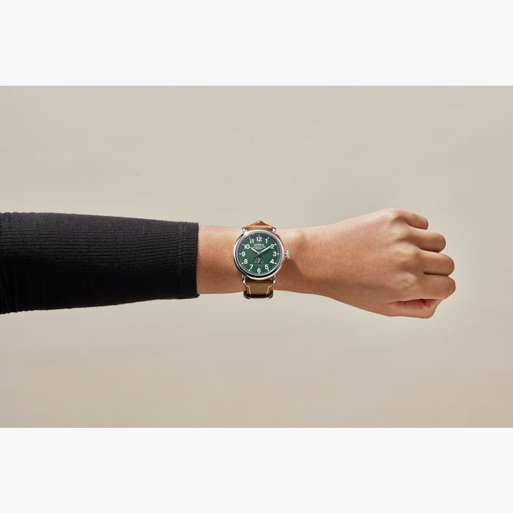 Its hard not to envy a face like this one. This 41mm Runwell features a rich green dial set in a solid stainless steel case finished with a classic pumpkin crown. The double-domed sapphire crystal protects the watch from scratches through years of wear. The leather strap in maple will develop a unique patina over time to give your timepiece a one-of-a-kind look.
