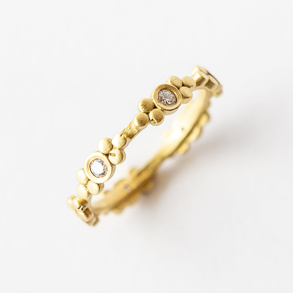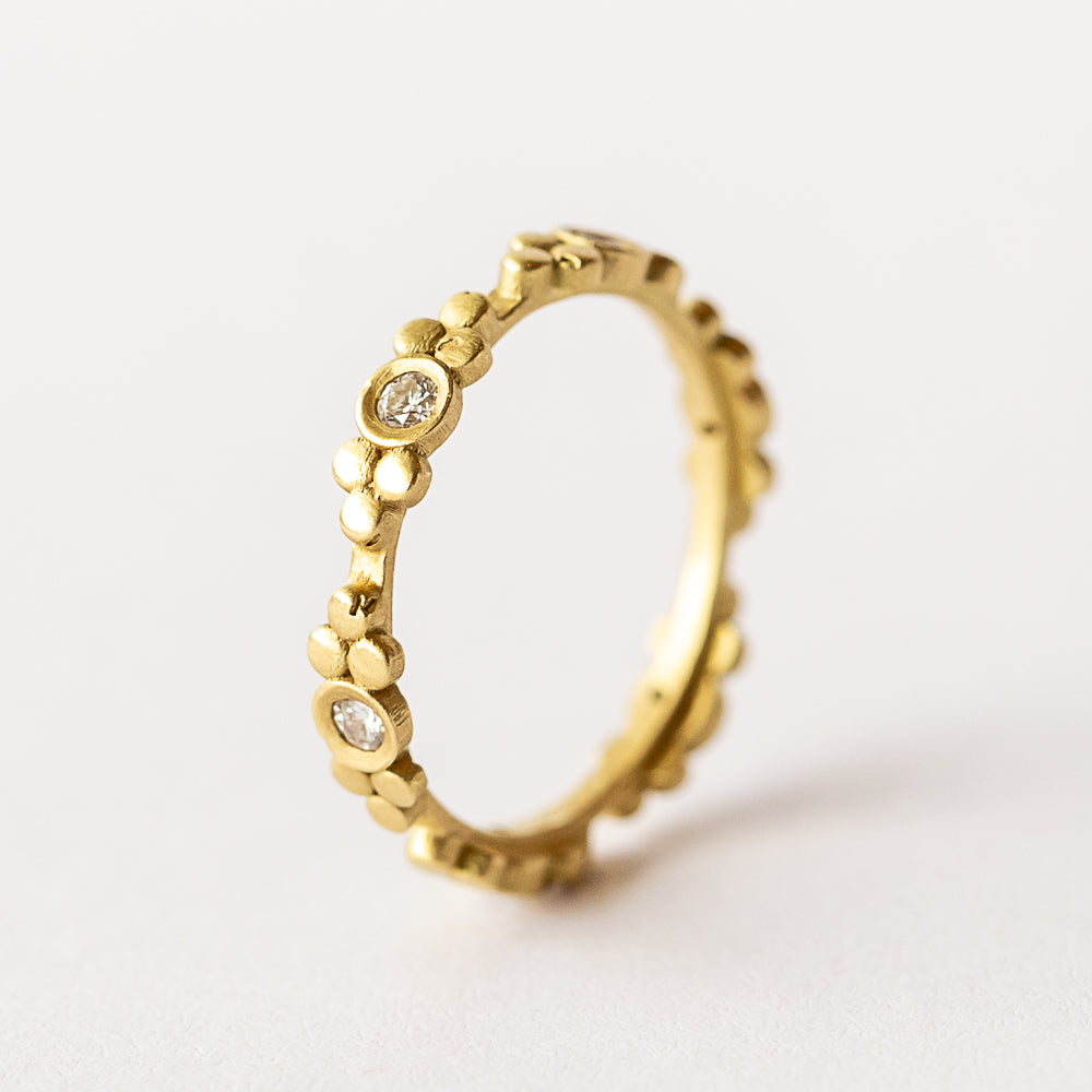 The Trios Eternity Band is stacking gold. Six crisp white diamonds and clusters of gold dots wrap a slender 18k yellow gold band with a matte finish. Slim at about 3mm wide, it’s the kind of ring that plays well with others but still knows how to hold its own.