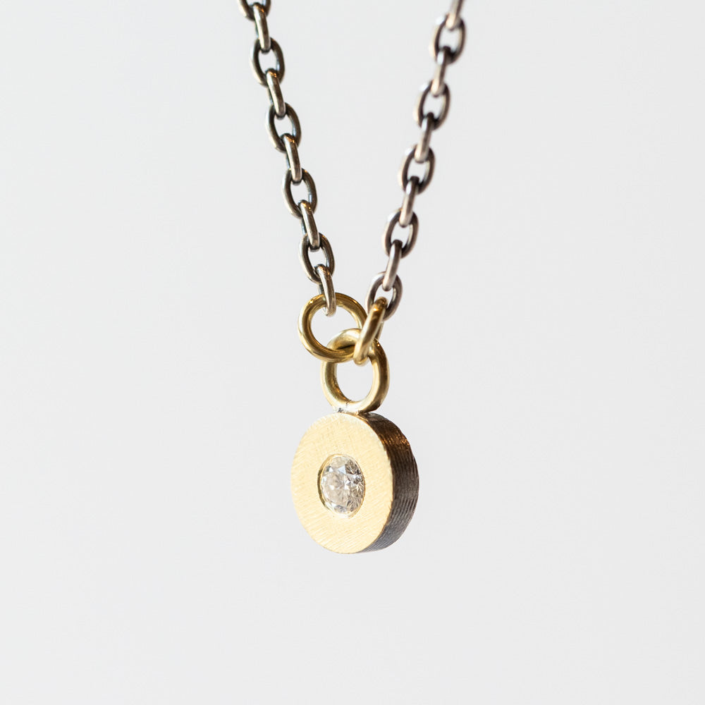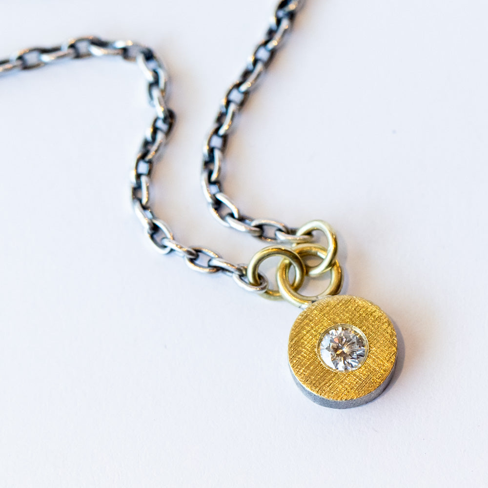 Round pendant set with a single diamond, 18k yellow gold over sterling silver, stationed on a sterling silver chain