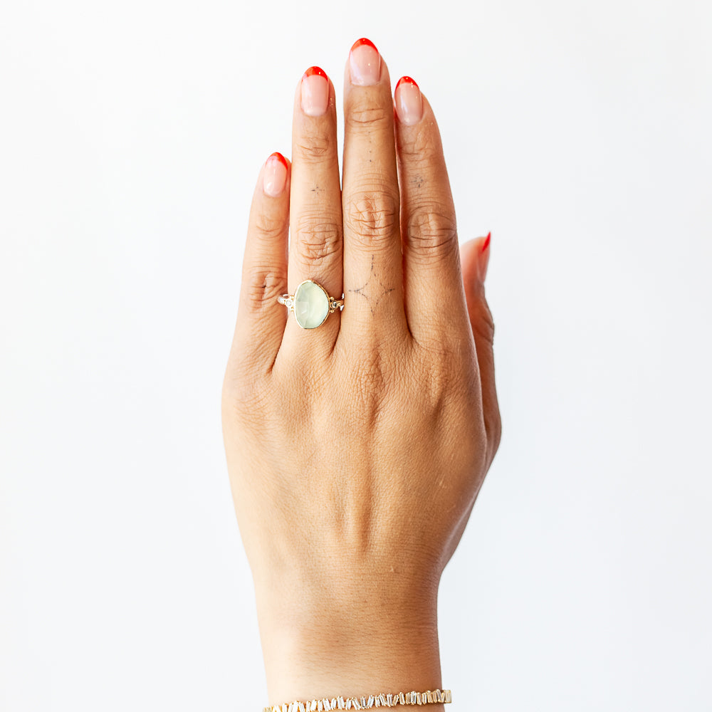 Prehnite—long associated with inner peace, intuition, and unconditional love—makes this ring feel like a wearable exhale. Whether you're stacking it with other textured favorites or letting it shine solo, this pastel piece brings calm confidence to your jewelry lineup. A soft statement for the earthy romantics.
