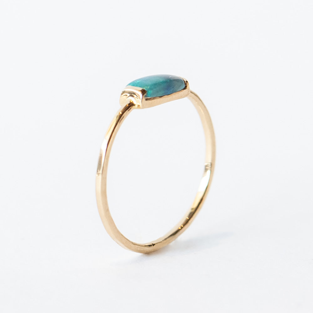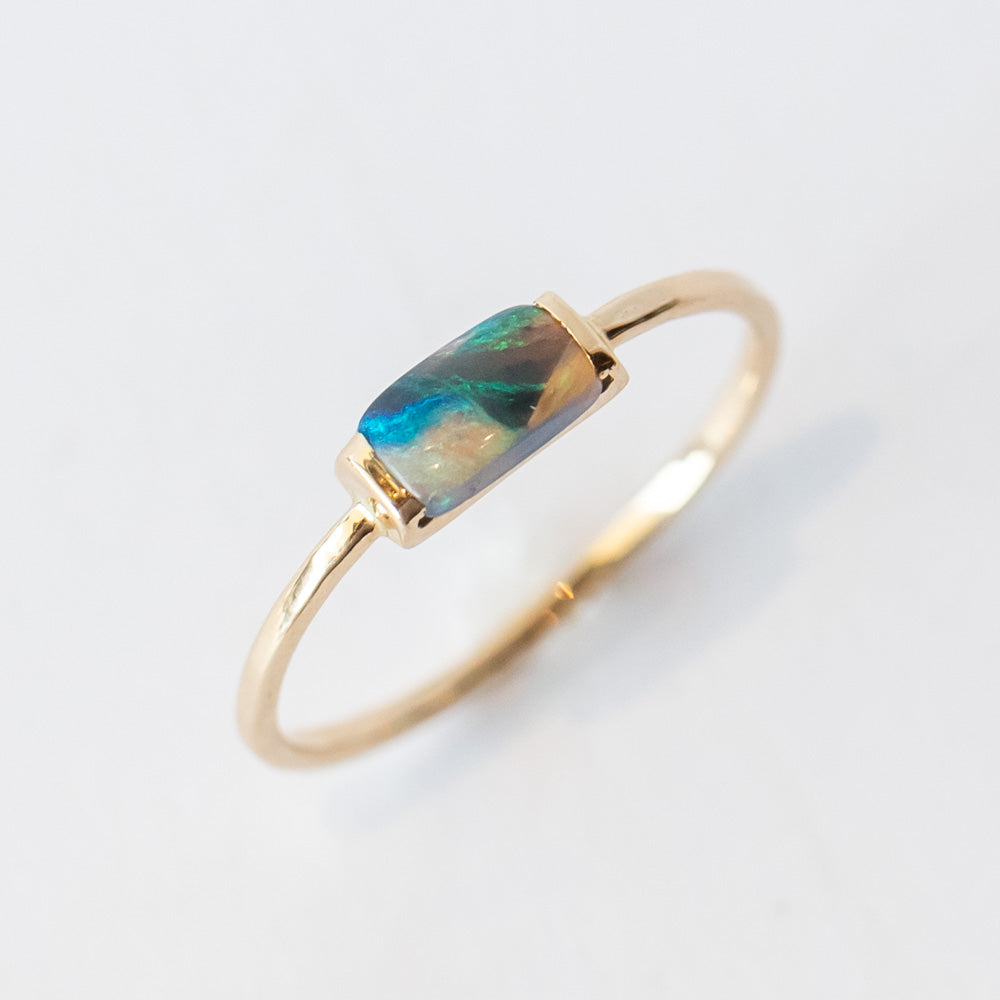 Tiny but mighty, this dainty gemstone stacking ring features a bar-set, elongated rectangular Australian opal that packs a little punch of color. The opal shines with mesmerizing flashes—blue, green, and a little bit of magic. Set in sleek 14k yellow gold with a delicate band, it’s the perfect addition to any stack, or just as a minimal statement on its own. Opals, the birthstone for October, are known for sparking creativity and boosting emotional expression—so not only will this ring look great, but it’ll also bring a little extra inspiration to your day. Effortlessly chic and totally timeless, this piece is made for those who love a little pop of color and a lot of style.