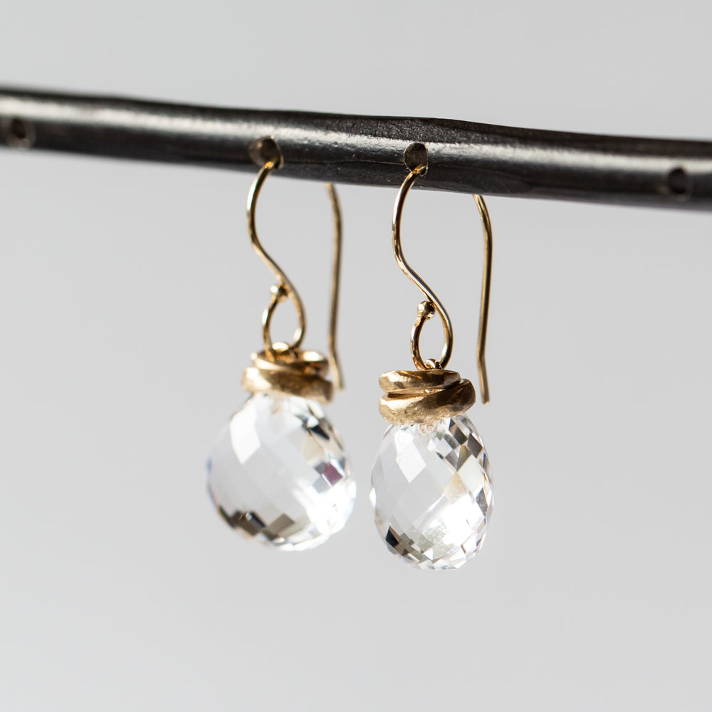 Faceted clear rock crystal quartz earrings with two satin organic accent rings on 14k yellow gold ear wires