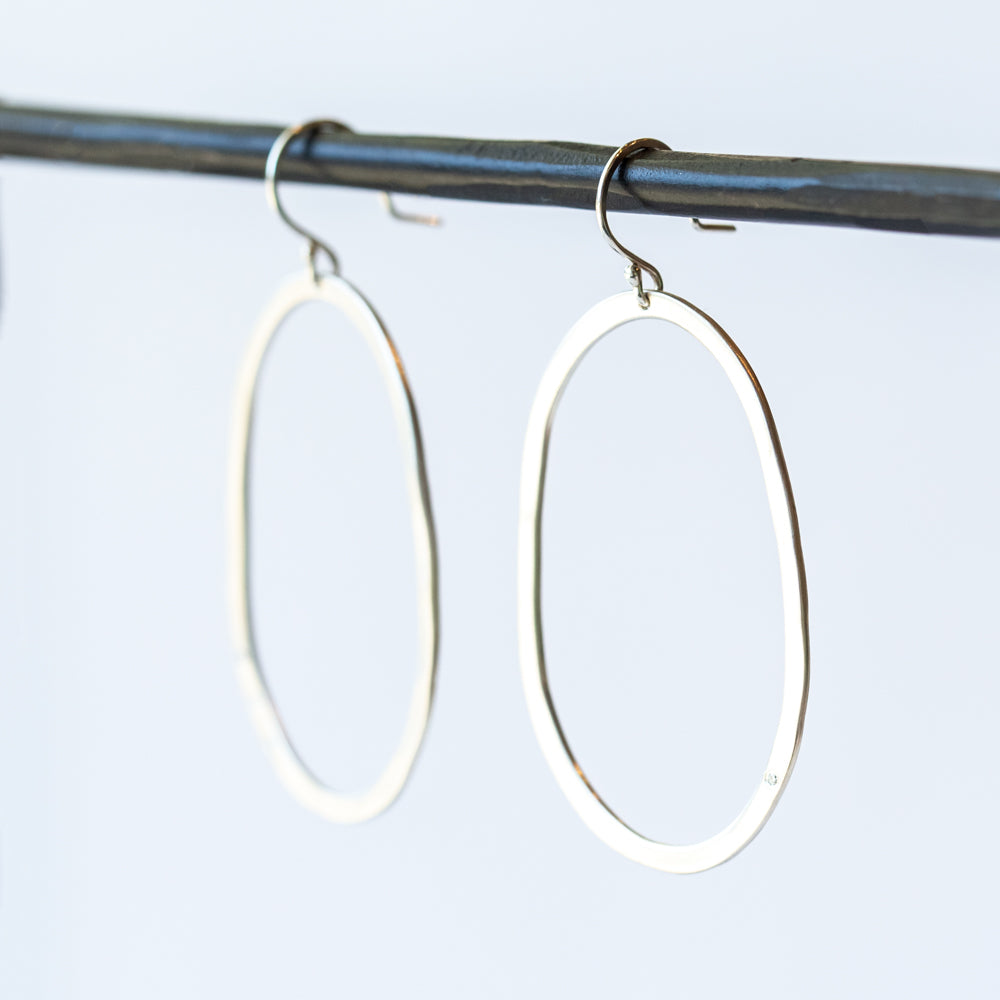 These large diamond pebble earrings from Sarah McGuire are a study in natural beauty—echoing river stones polished by time and elevated with just the right amount of sparkle. Each organically shaped open matte sterling silver oval is hand-hammered and set with white diamonds—three on one earring, one on the other—for a look that's quietly brilliant and beautifully balanced.