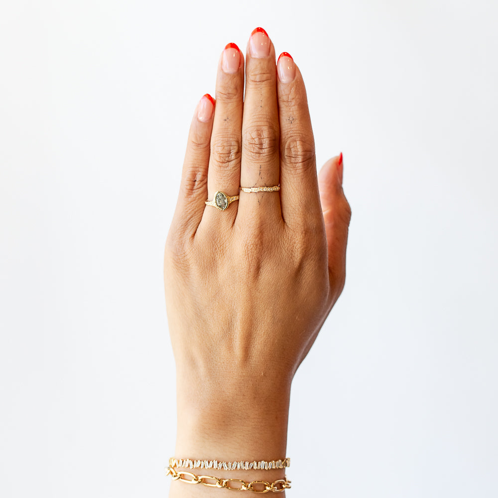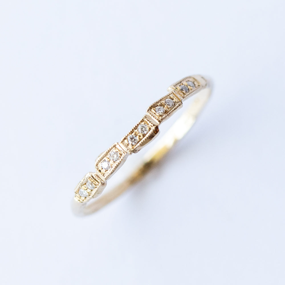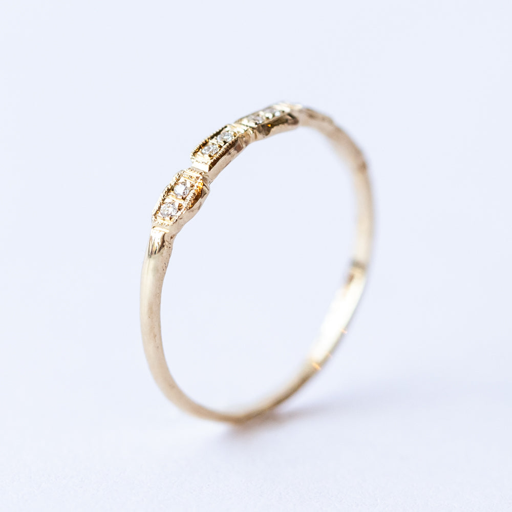 Take the scenic route every time with the Scenic Diamond Ring from Misa. This slender gold band features a textured top of tiny rectangular sections—think layered canyon vibes—with delicate white diamonds and subtle milgrain details adding just the right touch of edge and sparkle.