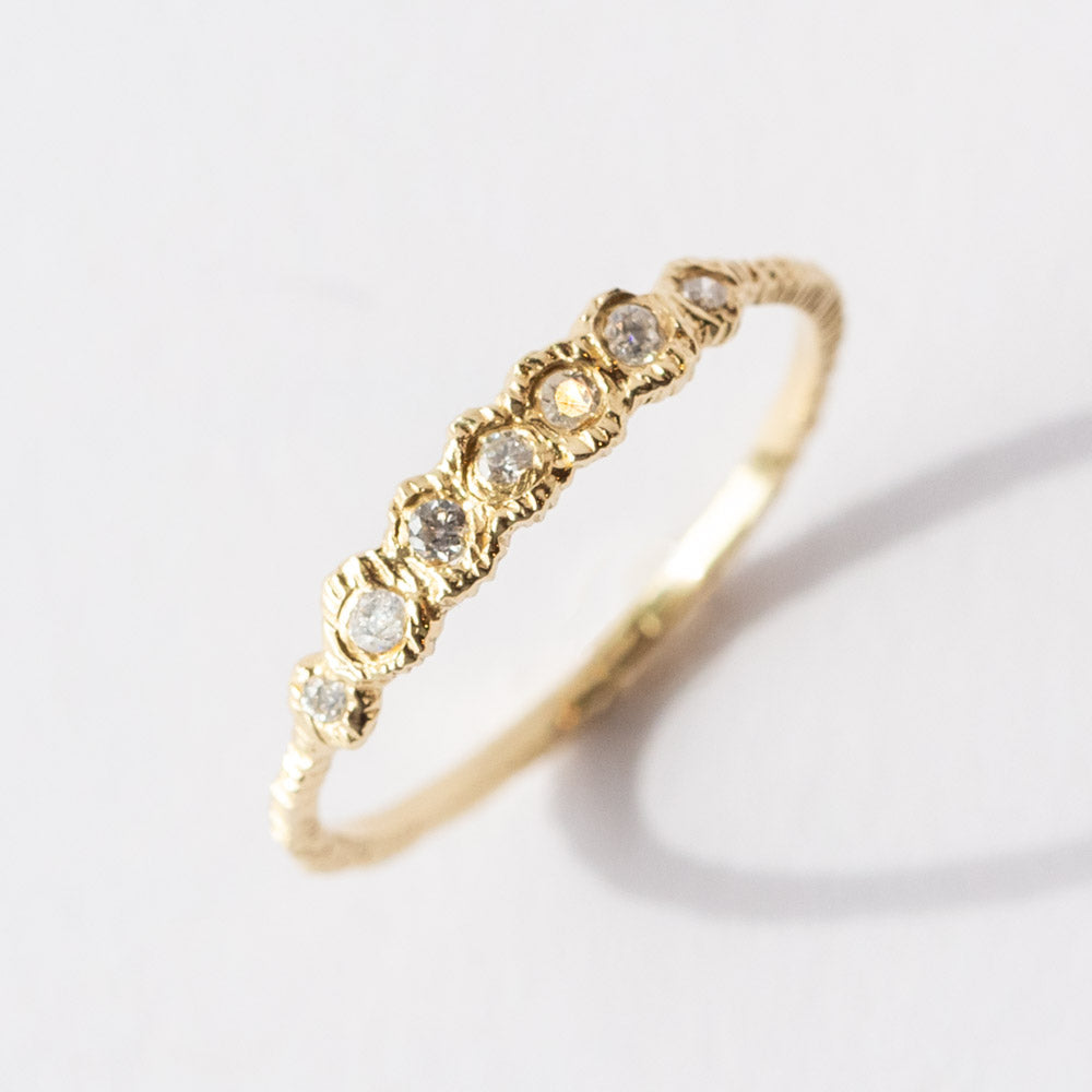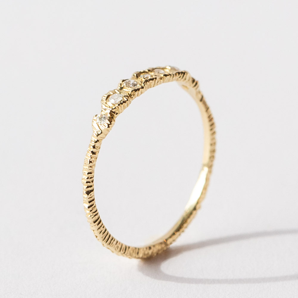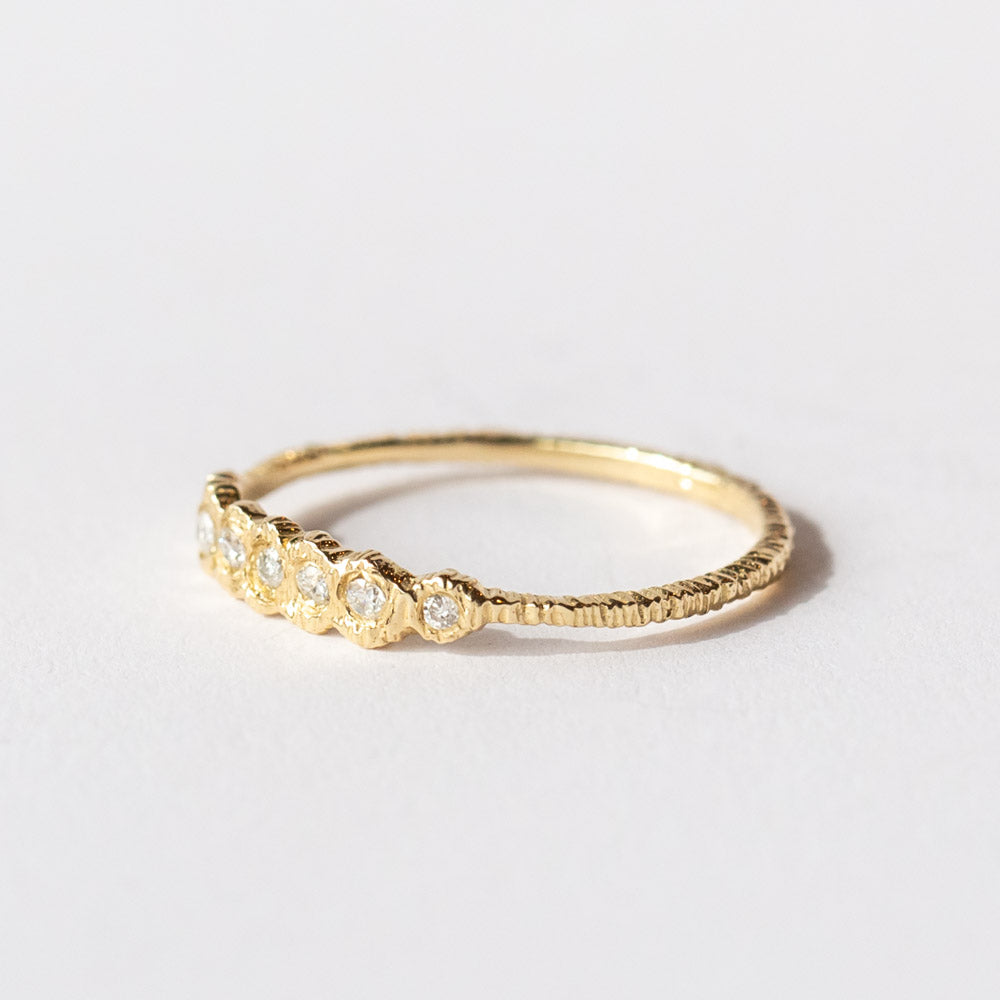 This petite diamond band from Danielle Welmond gives you handmade beauty mixed with modern brilliance. A fresh take on a classic diamond band style, this one features seven petite bezel-set diamonds in shimmering bezels. The designer's signature textured gold gives it an added sparkle that truly stands out whether worn alone for a minimalist look or stacked with your favorite rings for a layered look.