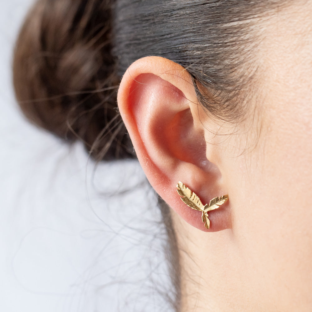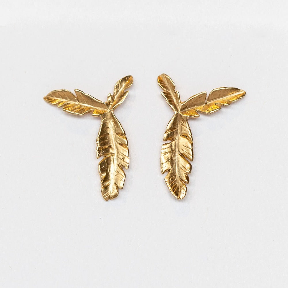Triple feather stud earrings in 14k yellow gold