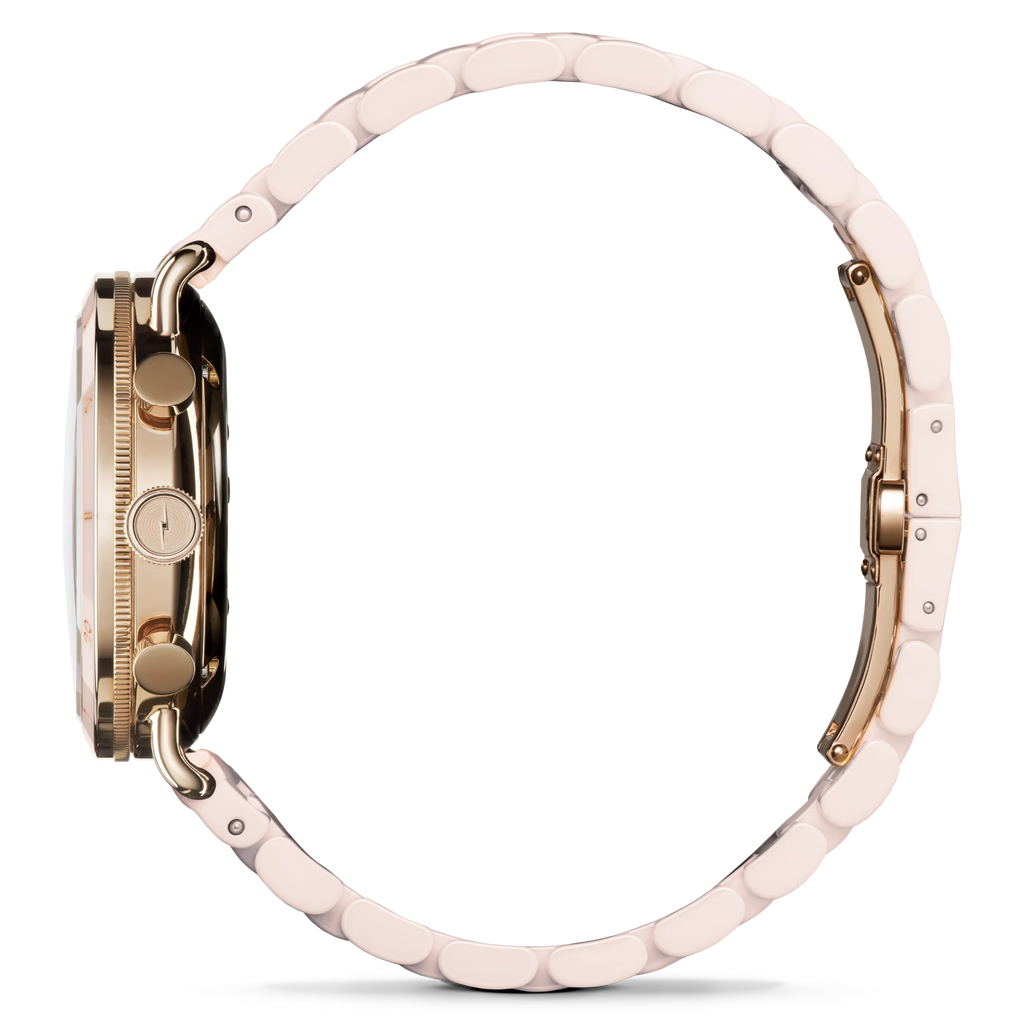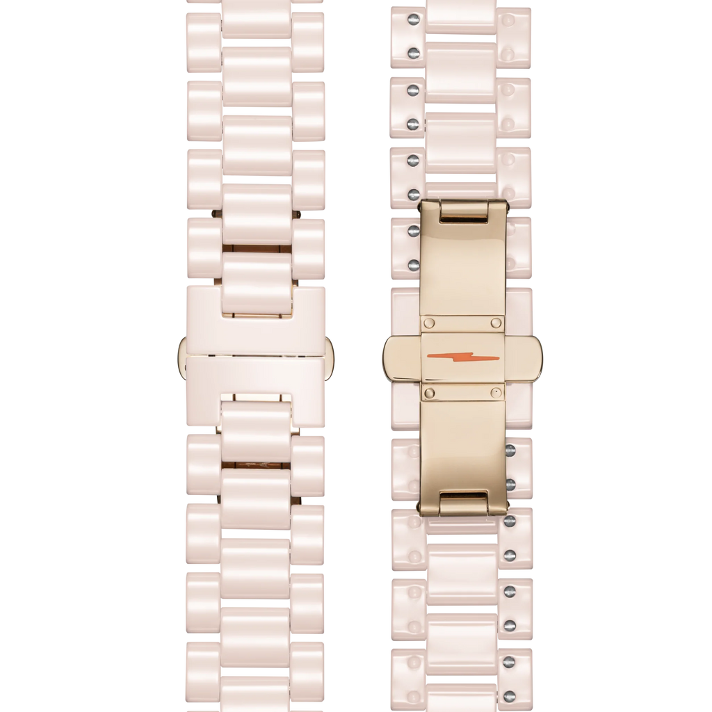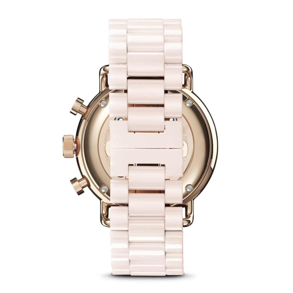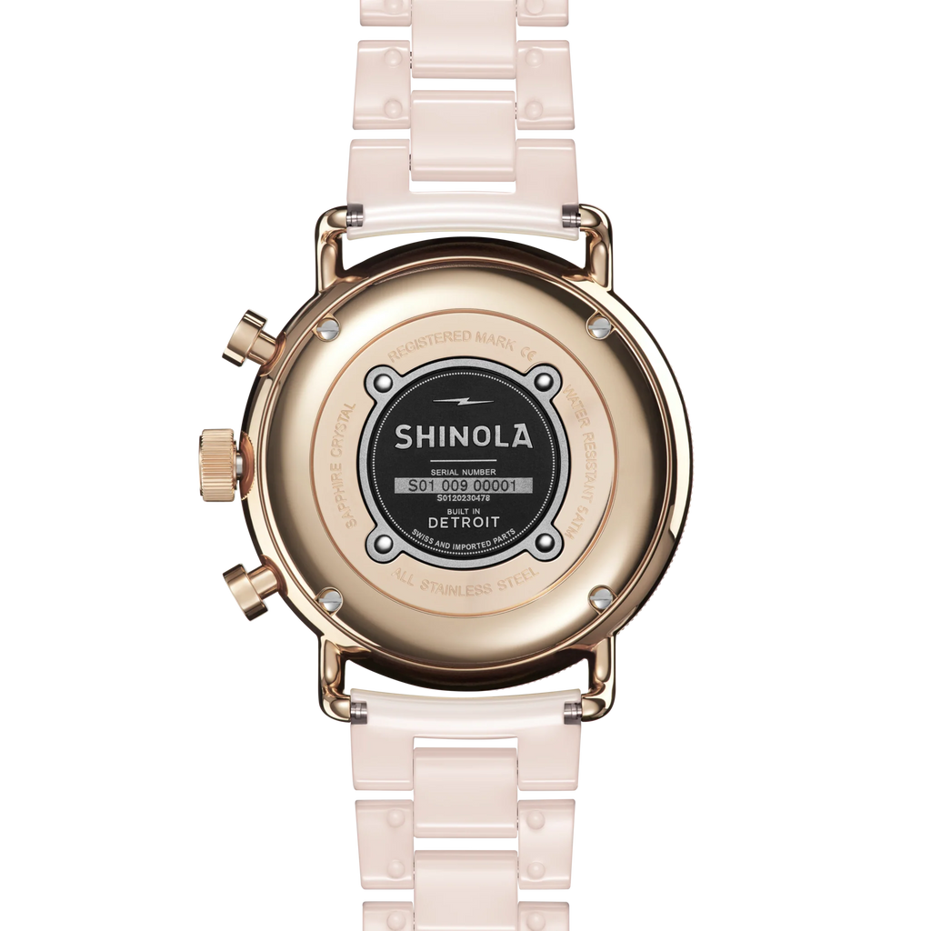 Featuring a mother-of-pearl dial, blush ceramic bracelet, and champagne gold accents all around, the 40mm Canfield Sport by Shinola is a stand-out in more ways than one. But it's just as impressive inside, with a three-eye chronograph movement that powers this heirloom-worthy timepiece. The champagne gold PVD steel case is encircled by a fixed bezel with blush ceramic insert, and the look is complemented by the ultimate accessory: scratch-resistant, durable, and lightweight ceramic three-link bracelet in radiant blush pink. Sporty but refined, the Canfield Sport is timeless and in this sophisticated colorway, it's a quintessential piece for your wardrobe.