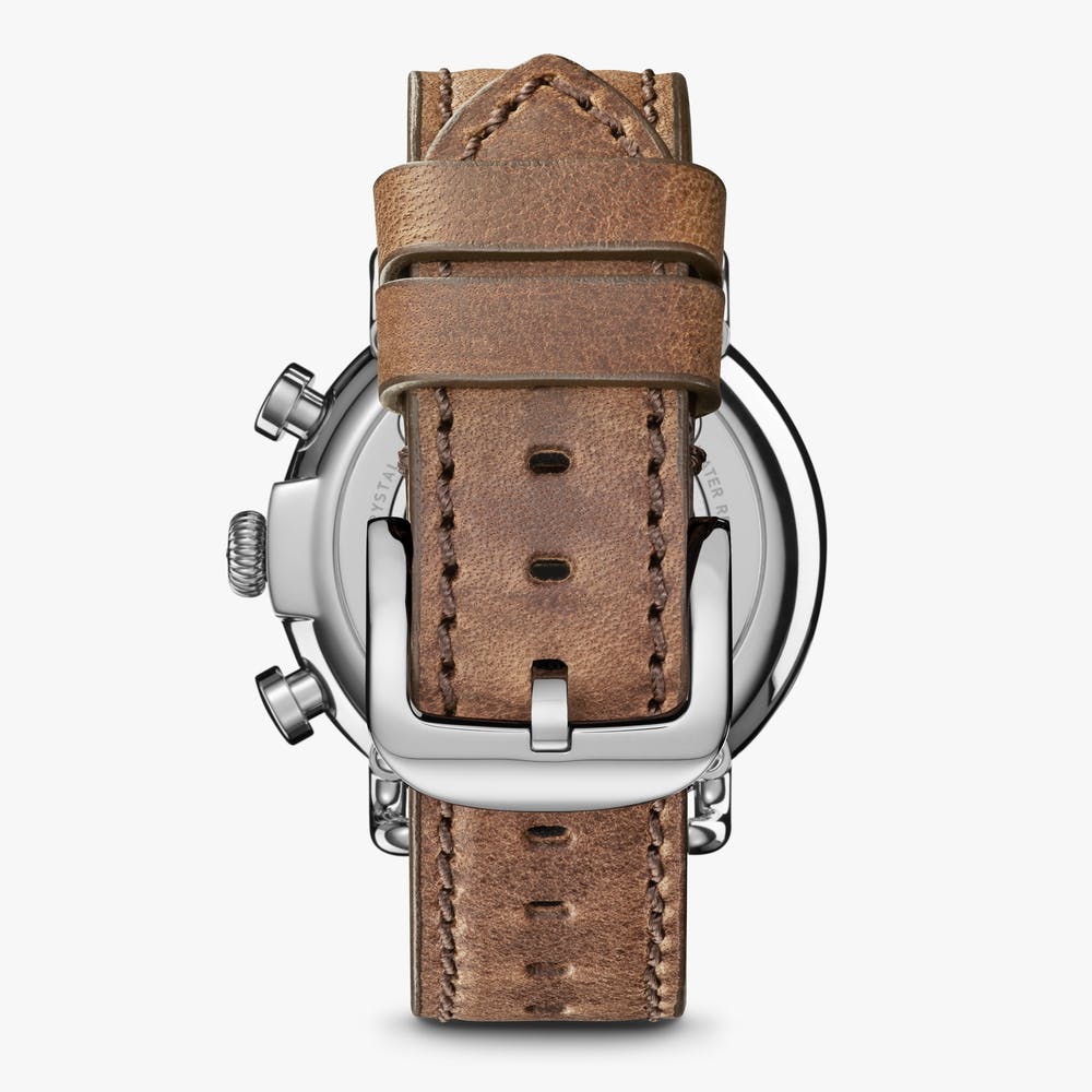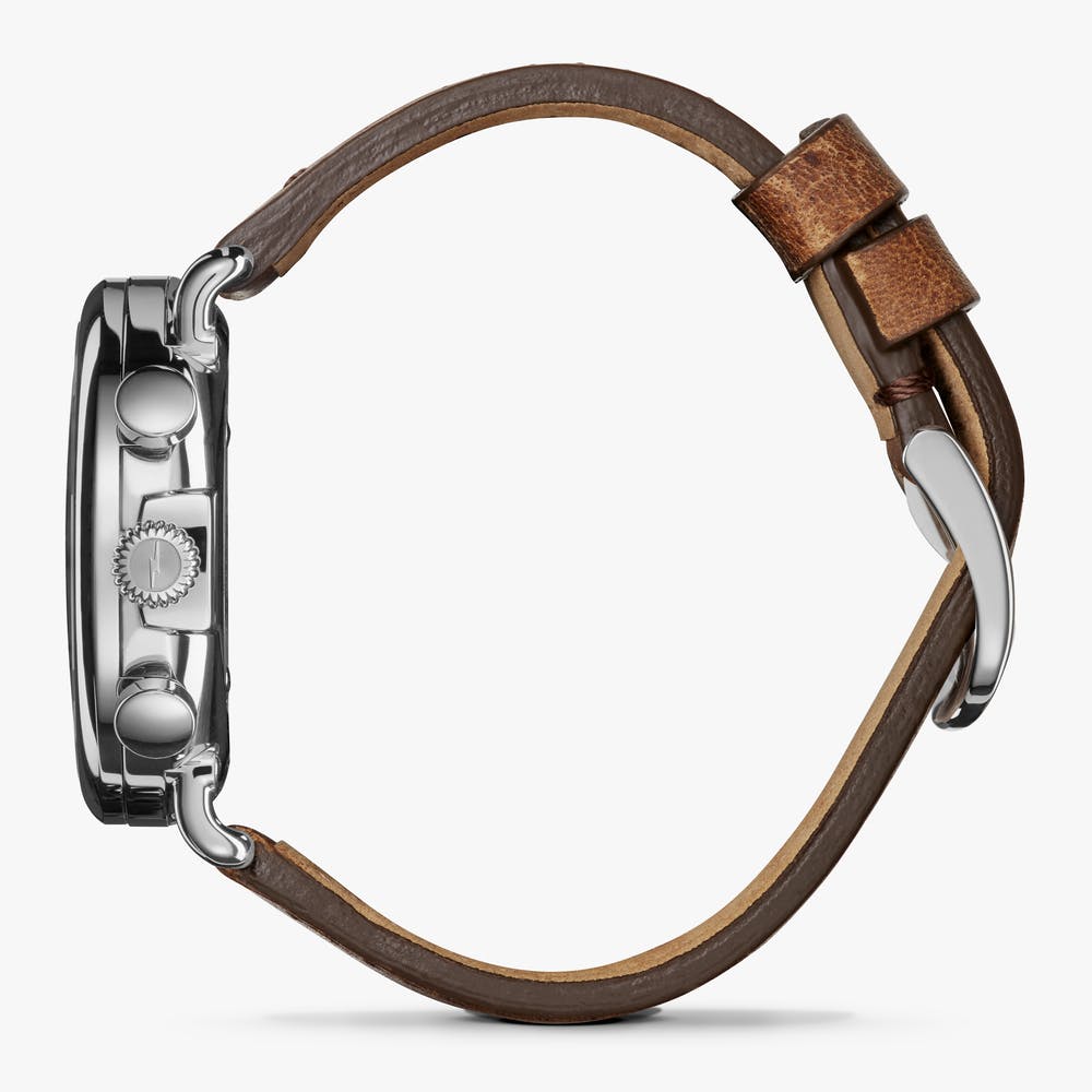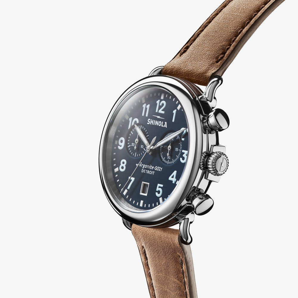 This chronograph combines classic style with versatile function. The 41mm Runwell Chrono features a polished stainless steel case, two sub dials, a calendar aperture, and captivating Super-LumiNova numerals that glow bright blue in the dark, complementing the matte midnight blue matte. Completed with the British tan leather strap, it's a watch you can rely on to keep you on time and up to date in style—from the office to dinner to the weekend.