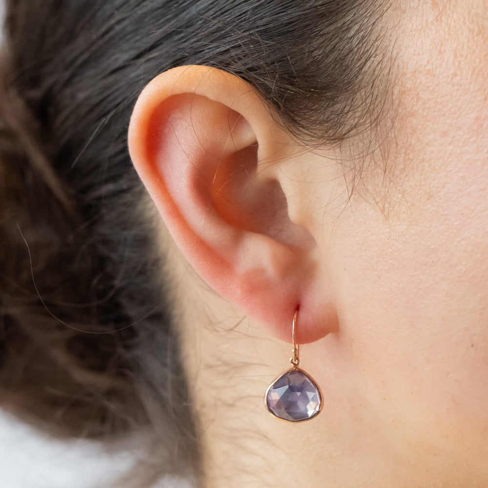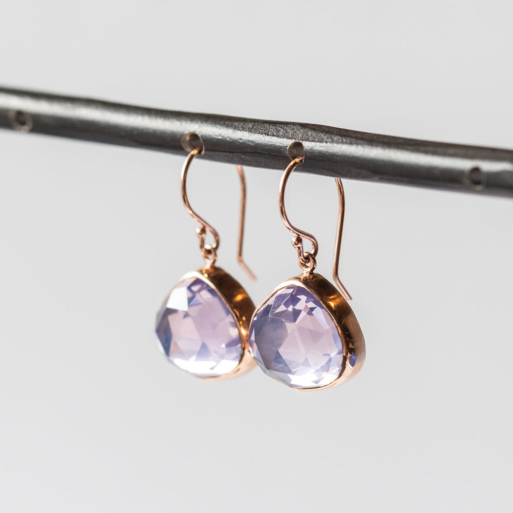 Rose cut lotus lavender amethyst drop earrings backed in sterling silver and bezel set in 14k rose gold