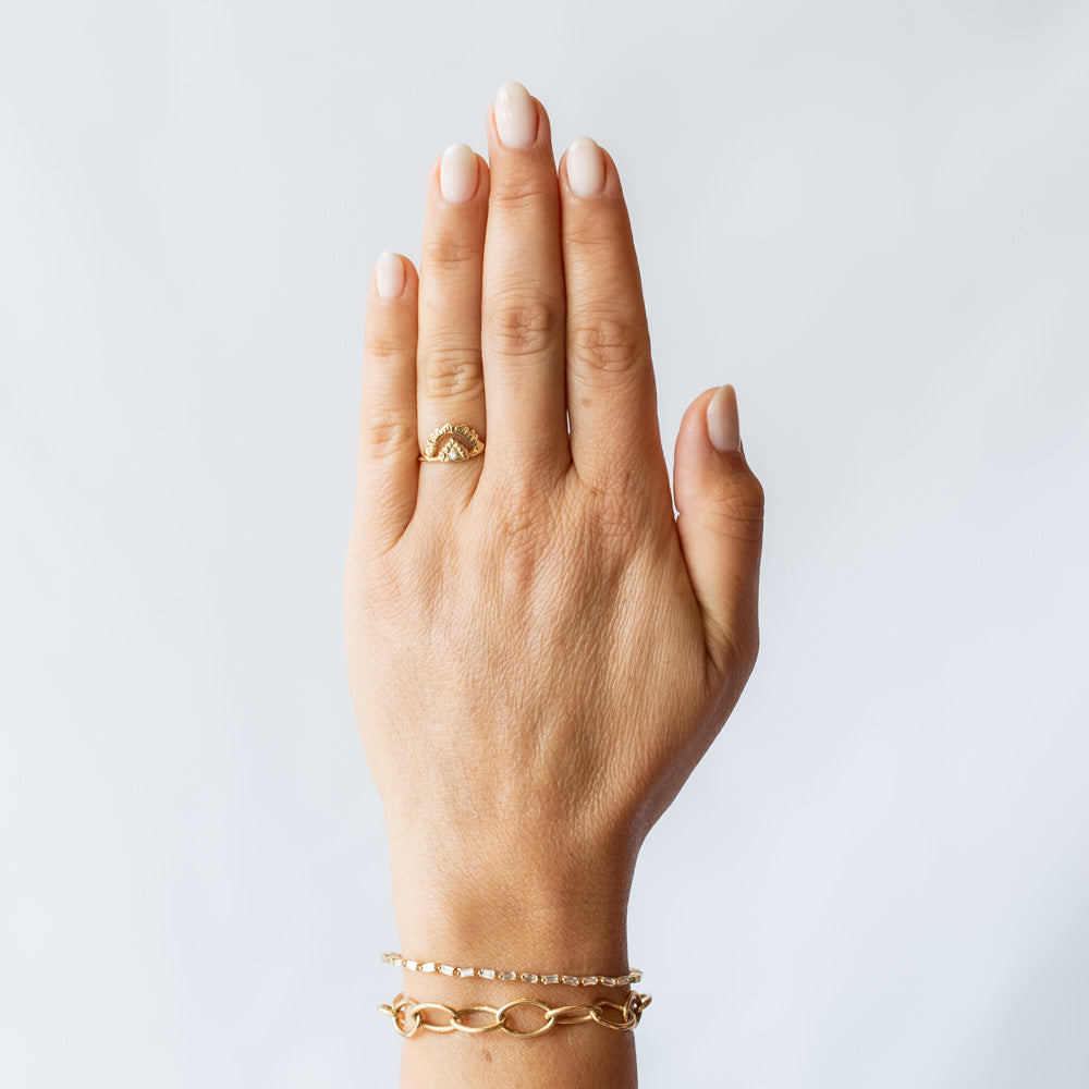 Whether worn on its own as a statement ring or against another stacking ring for a layered look, this hand carved 14 karat yellow gold ring from Communion by Joy gives you all the texture and light you need. Representing the light that always surrounds us protecting and lighting our way, hand carved details radiate out from a pyramid shape, set with a single white diamond.