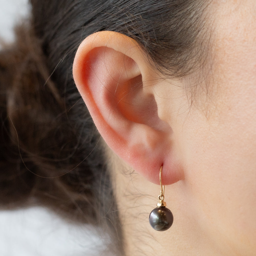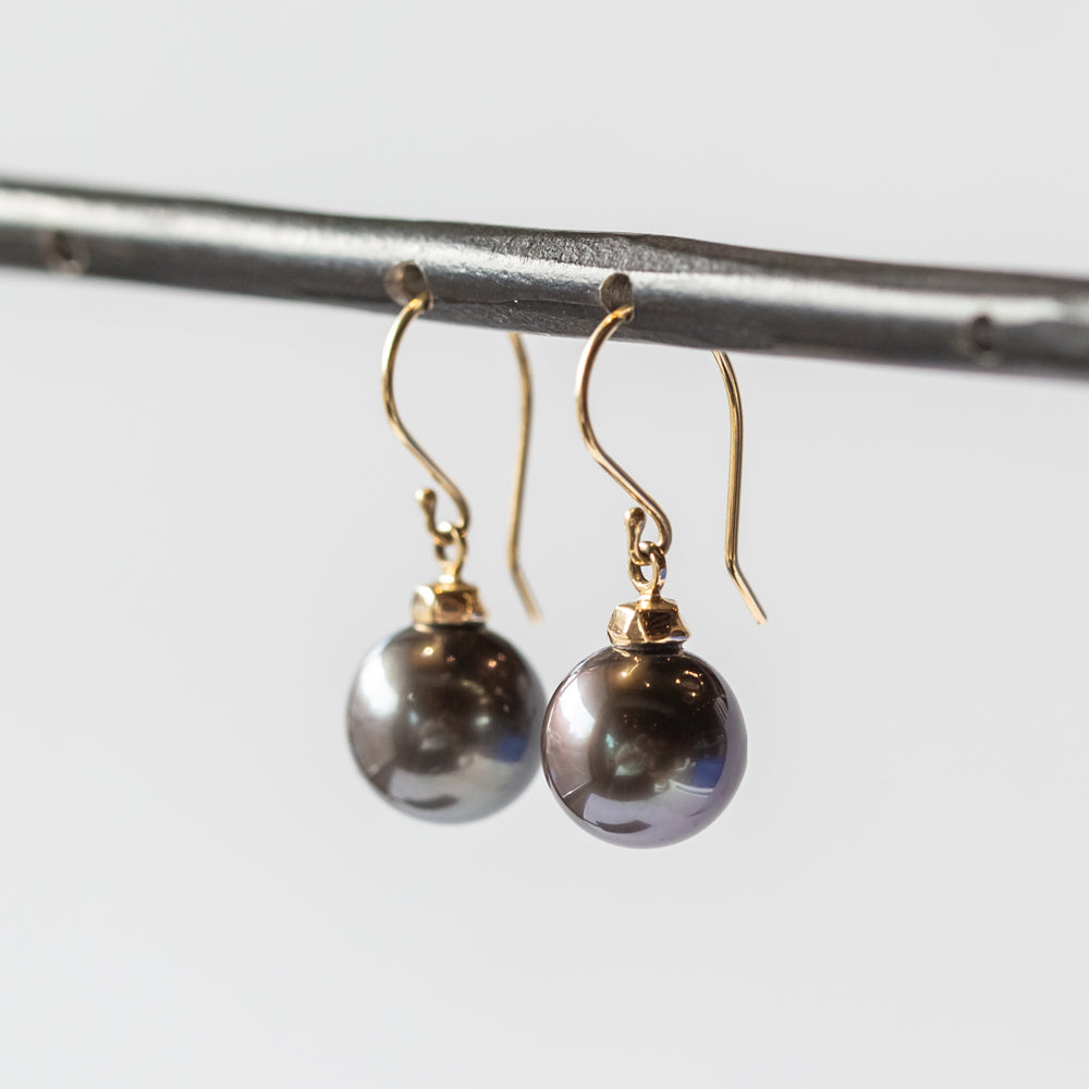 Round dark Tahitian pearl drop earrings set with 14k yellow gold boulder caps on 14k yellow gold ear wires