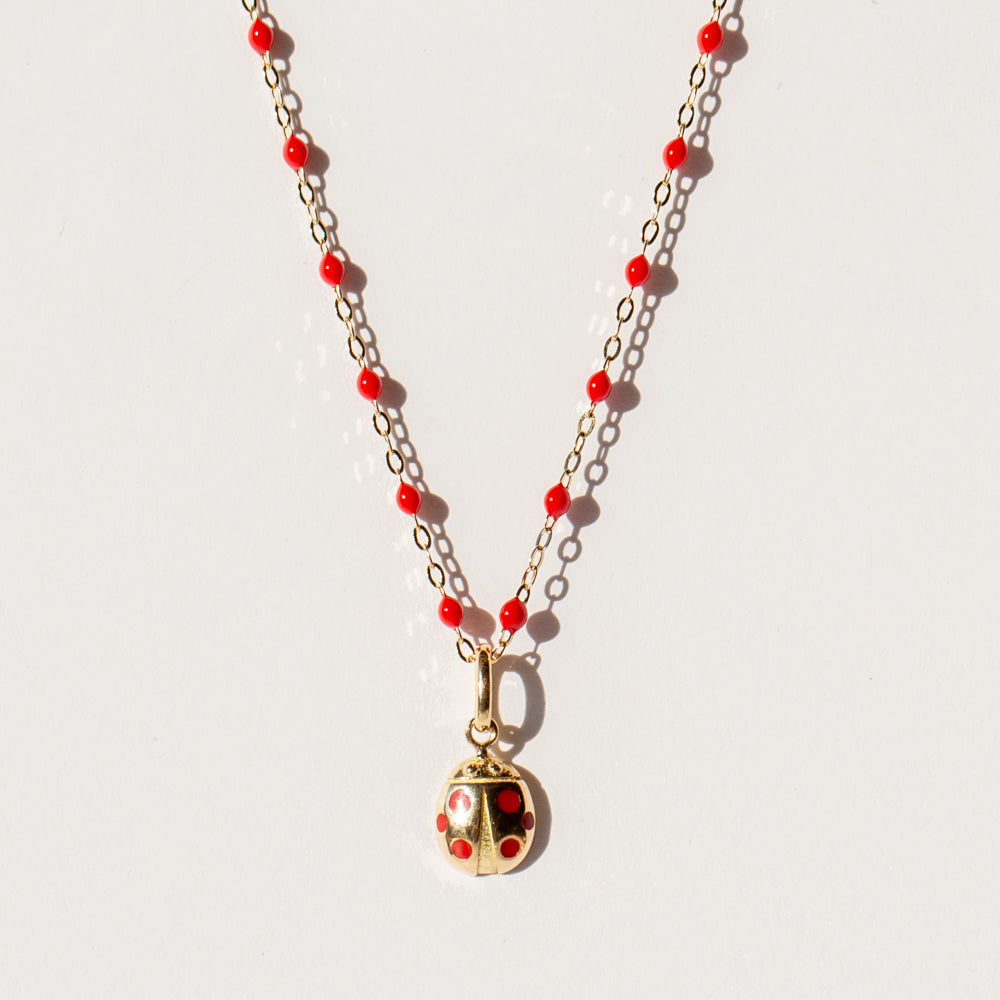 Its rich poppy-red hue adds a vibrant touch to your chain or bracelet, while the delicate gold details keep things chic and polished. Whether you’re a believer in lucky charms or just love a little pop of color in your stack, this sweet mini is your go-to for everyday joy.