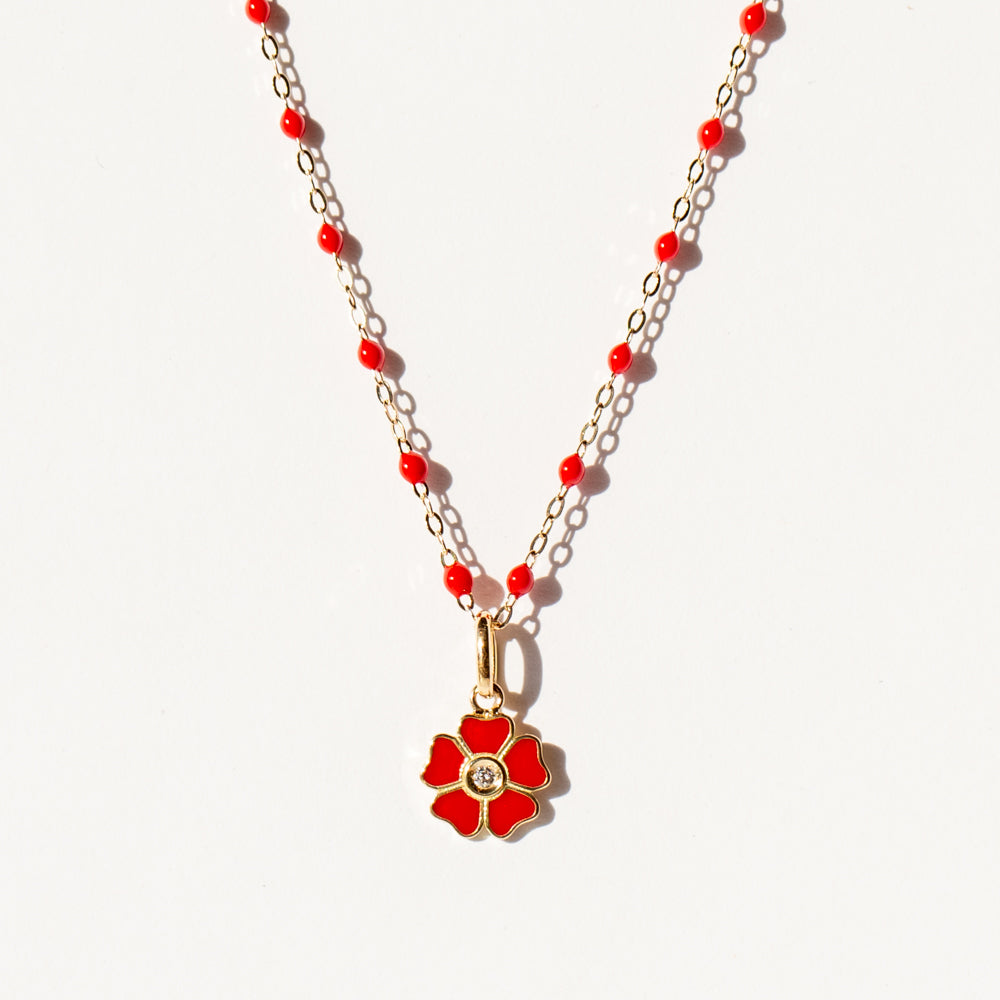 The Gigi Clozeau Poppy Flower Charm is a tiny burst of color and joy for your jewelry stack. Crafted in 18k yellow gold and filled with vibrant red resin with a tiny diamond at the center, this petite charm captures your playful, whimsical energy.