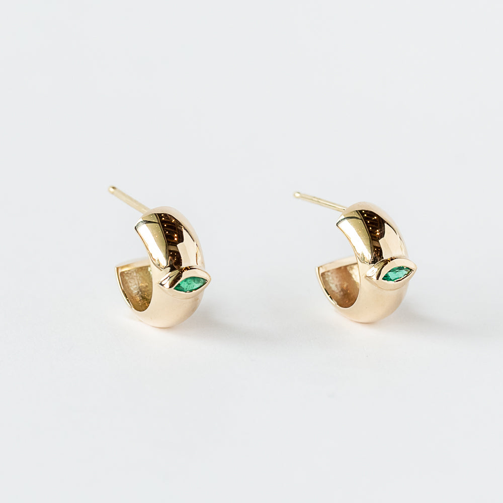 These chunky gold hoops are giving main character energy. Each 14k yellow gold huggie is set with a sleek marquise-cut emerald in a bezel setting right at the front for a flash of rich green that feels both timeless and totally now. Perfect solo or stacked with your everyday studs for a layered look.