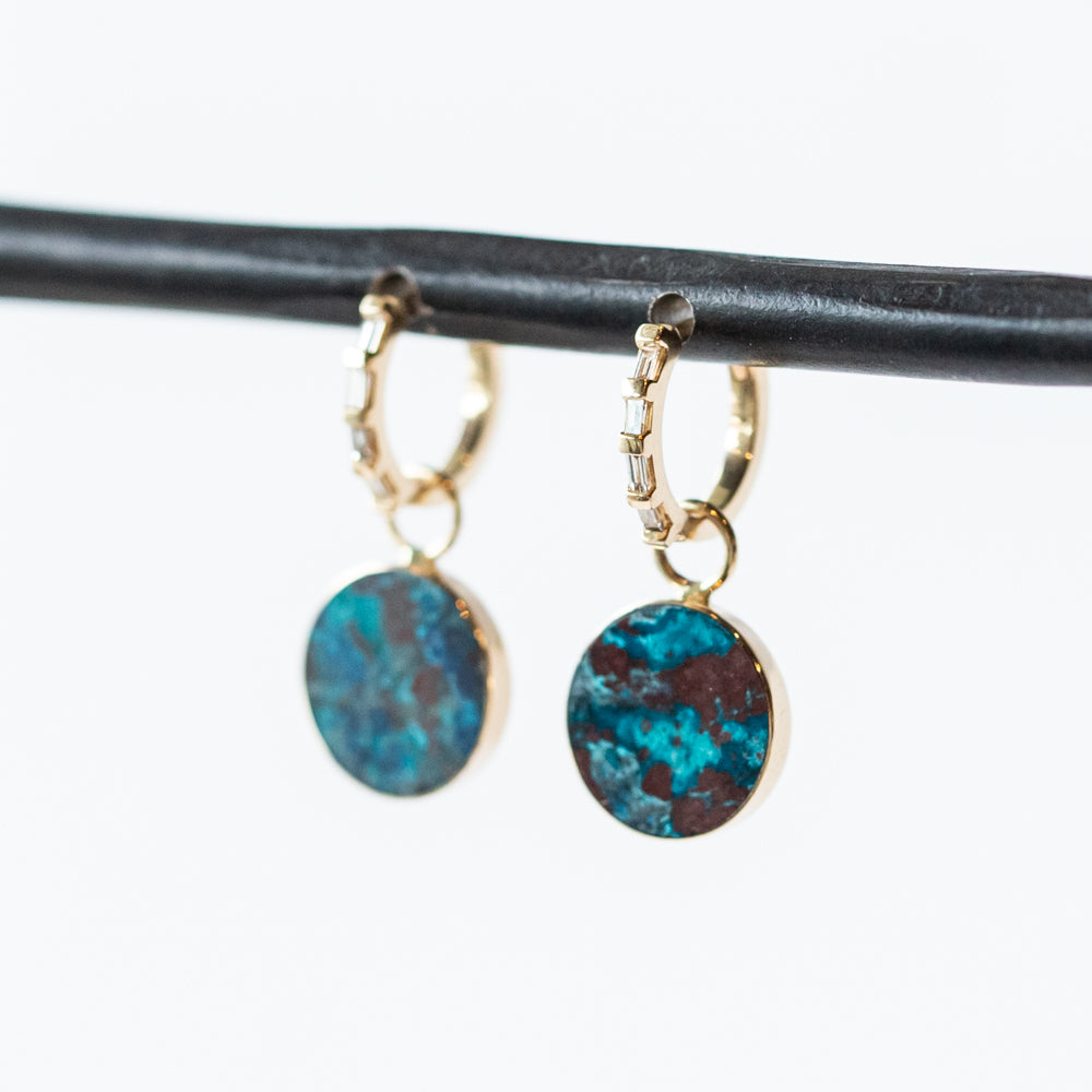 A deep blue circle of Shattuckite—like a mysterious galaxy swirling on your ears—hanging effortlessly from a warm 14k yellow gold huggie. Above it, a sleek line of baguette diamonds adds a clean, modern sparkle that’s anything but basic. You can also remove the drops and wear the diamond huggie hoops on their own for a minimalist everyday look.