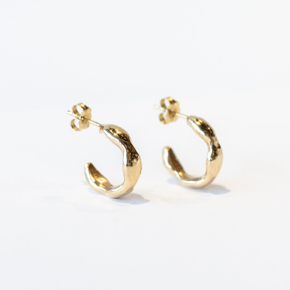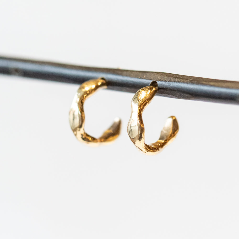 Add some modern organic texture to your classic gold hoop earring style with these ripple huggies from Adeline. It's a fresh take on traditional gold hoops, with ripple edges that glow in the light and a slightly puffed sized. Handcrafted from solid 14 karat yellow gold, these petite hoop earrings are perfect for everyday wear.