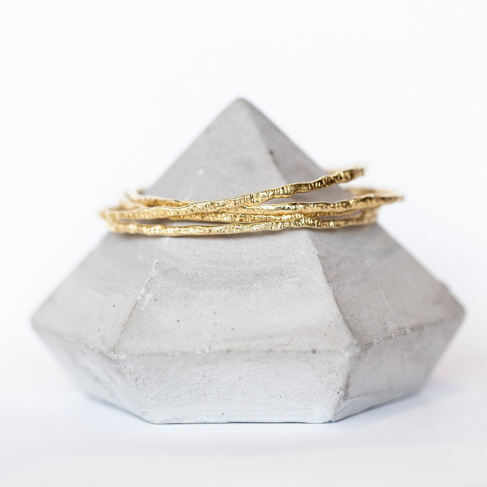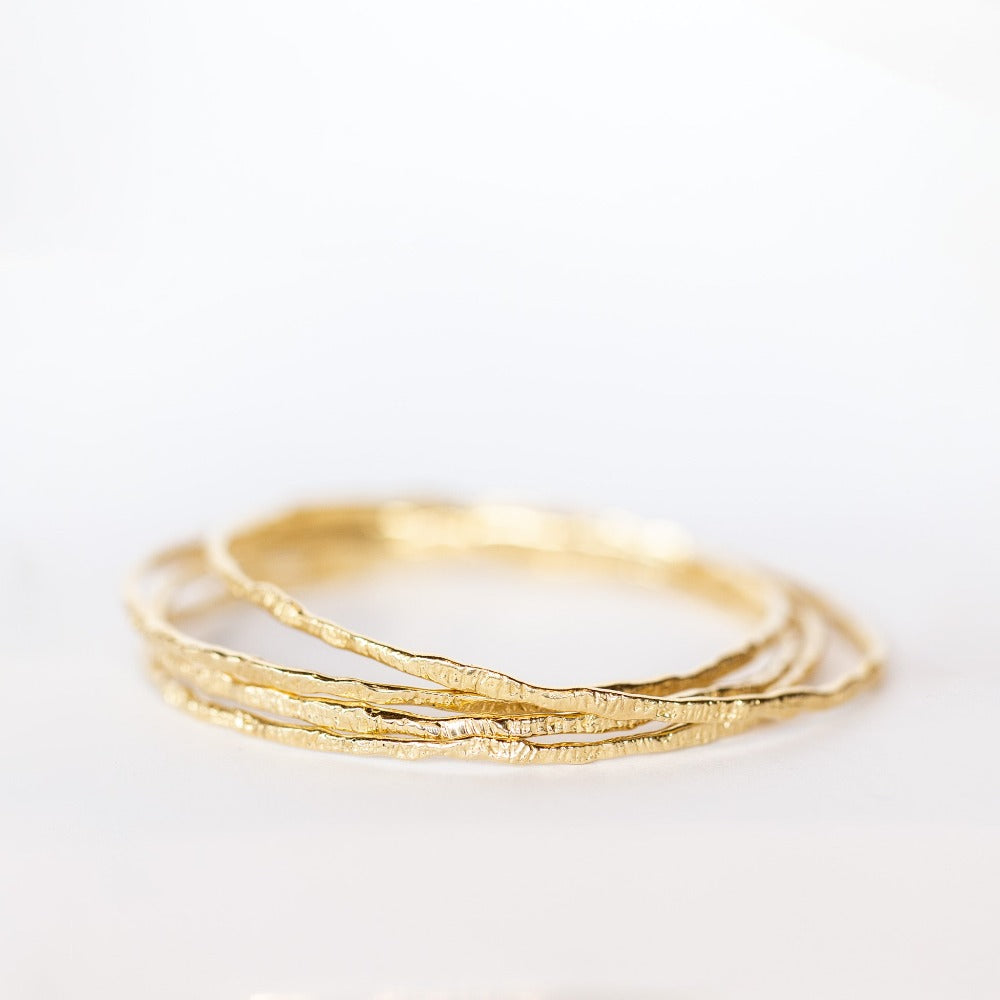 Hand carved in 14 karat yellow gold, this slender bangle bracelet is a talisman infused with the highest vibrations to protect us on our journey in life. It shines brightly on its own but also looks fantastic in a gorgeous stack of bracelets. Mix and match to your heart's content.