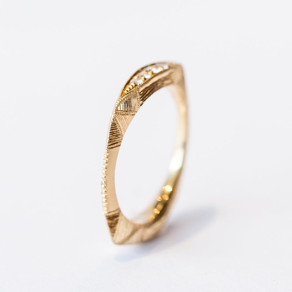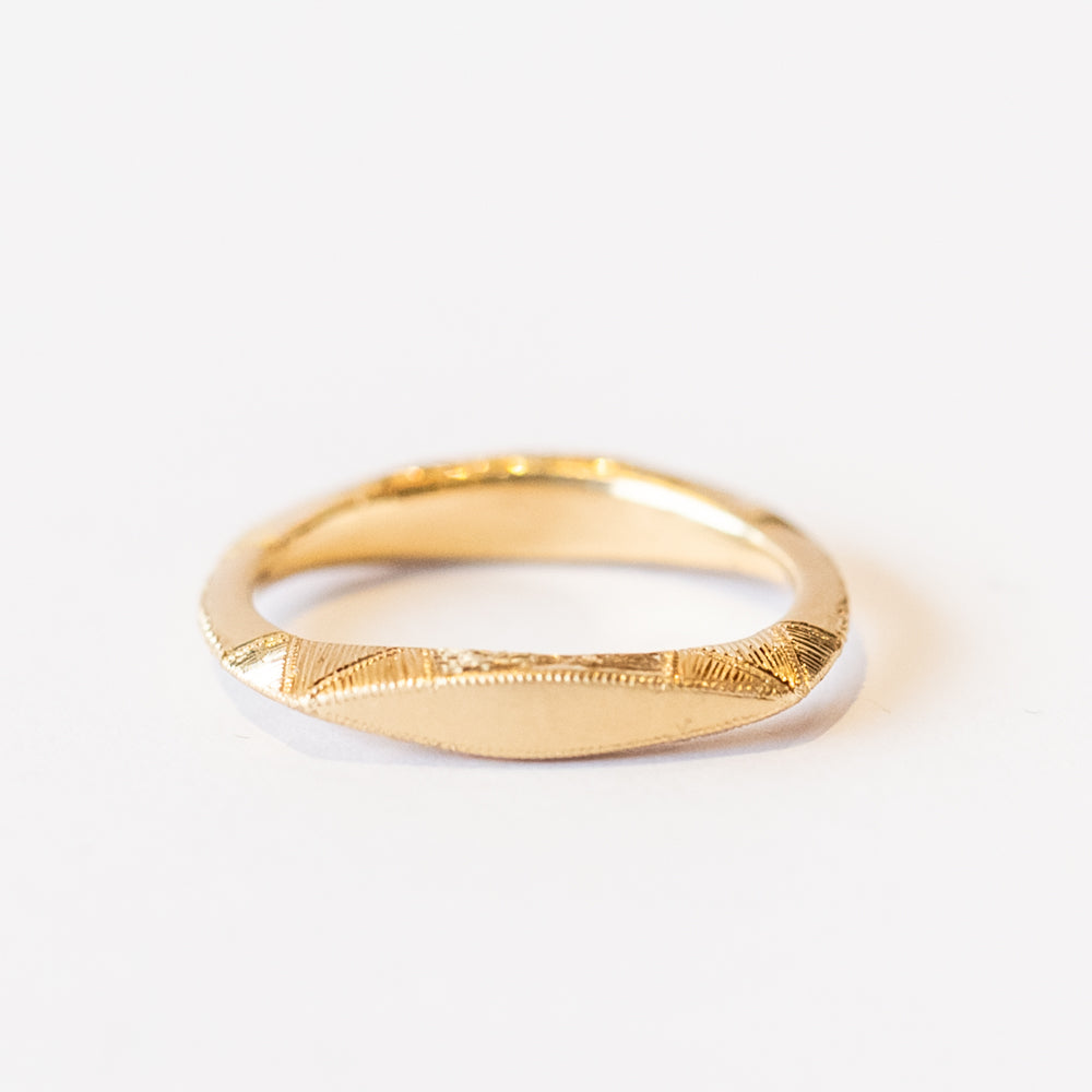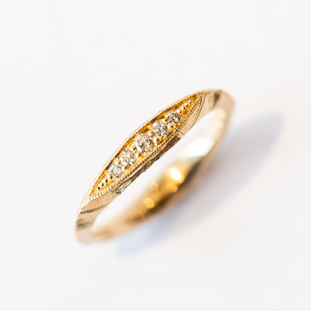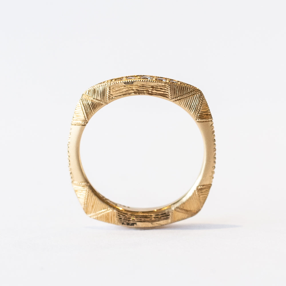 A sleek blend of vintage inspiration and modern design, this 18k yellow gold band features a distinctive square shank for a contemporary edge and a comfortable fit. The matte finish enhances the richness of the gold, while bright deco-style engraving on both sides adds an element of refined detail. A row of five graduated melee white diamonds sparkles across the top, offering a subtle yet striking brilliance.