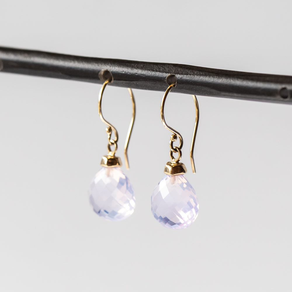 Faceted lavender amethyst drop earrings with 14k yellow gold boulder caps on 14k yellow gold ear wires