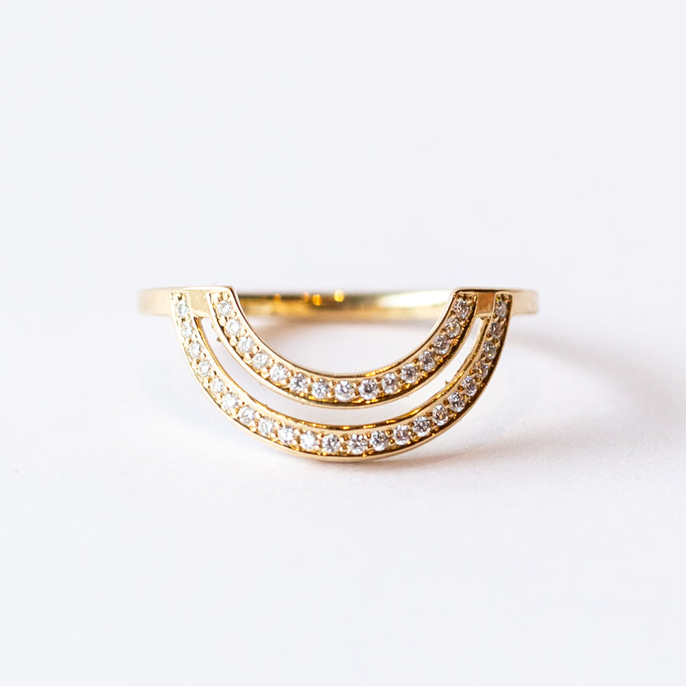 If your ring stack needs a little drama (the chic kind, of course), the Rioga Ring delivers. This contour crown ring features two radiant arcs of pavé-set reclaimed diamonds, layered to create a halo effect with airy negative space and serious sparkle.